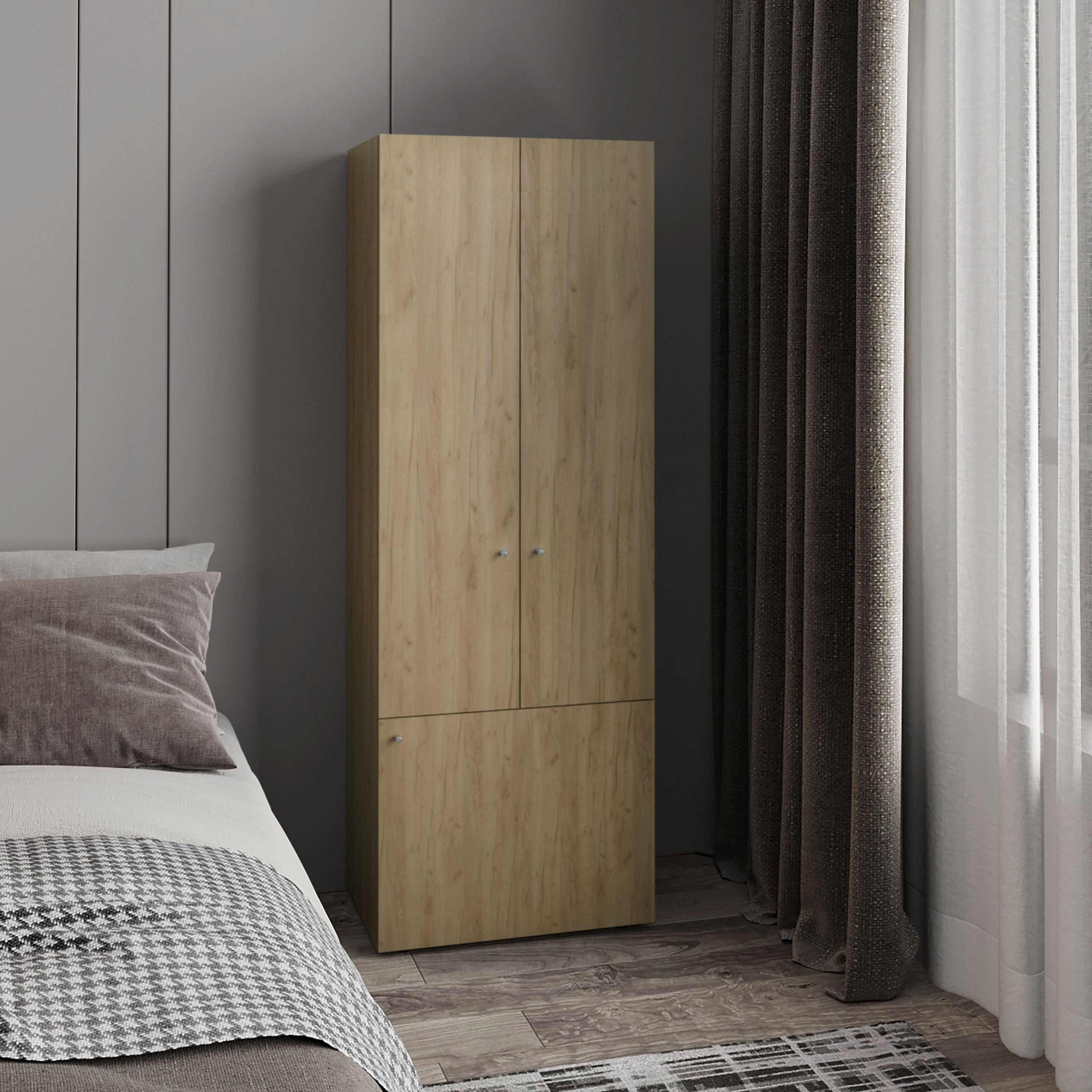 Organize your bedroom, laundry room, or small apartment with this sleek and space‑saving 3-door closet system. Designed for narrow spaces, it combines hanging and shelf storage to keep clothing, shoes, and daily essentials neatly arranged while adding a warm natural oak finish that complements modern interiors.