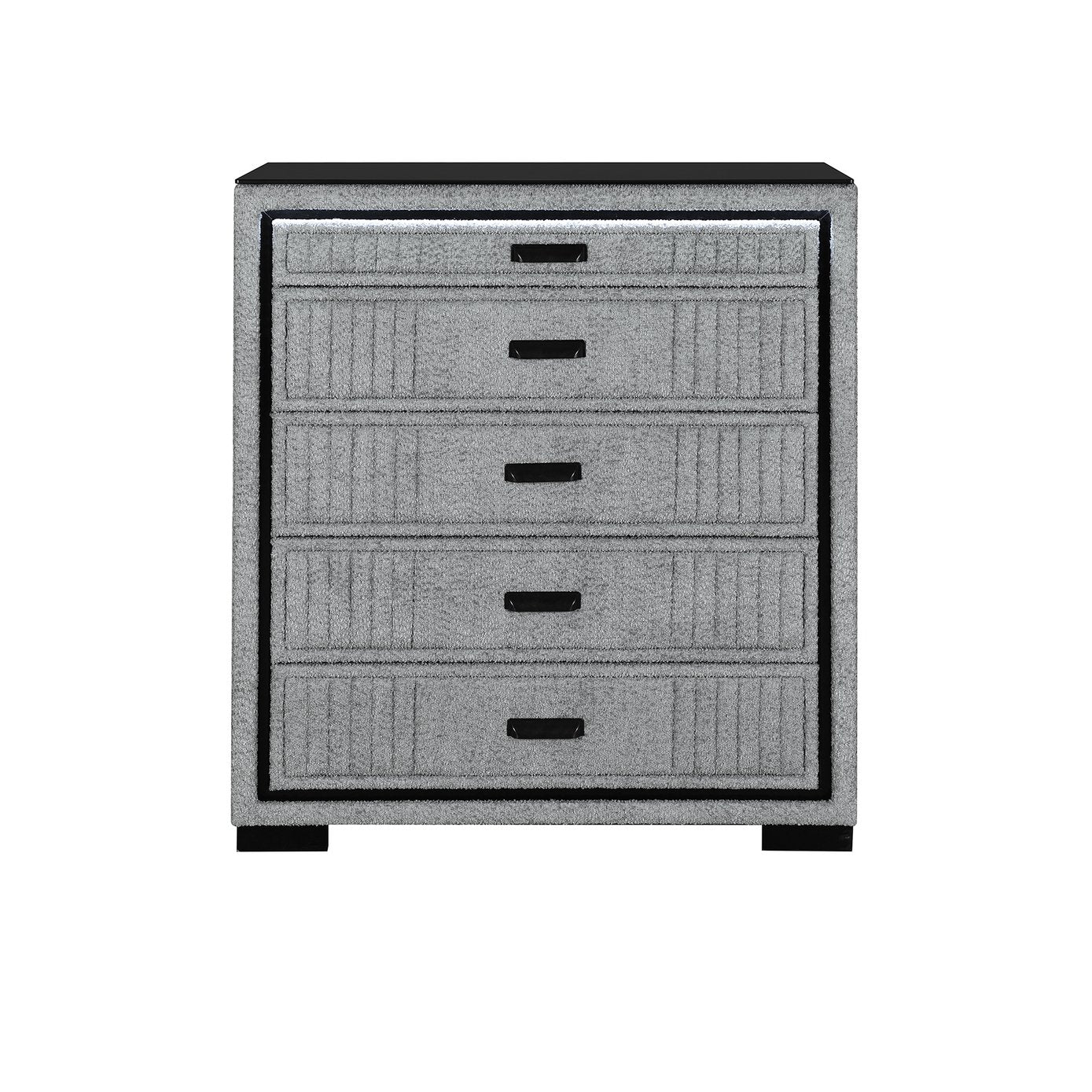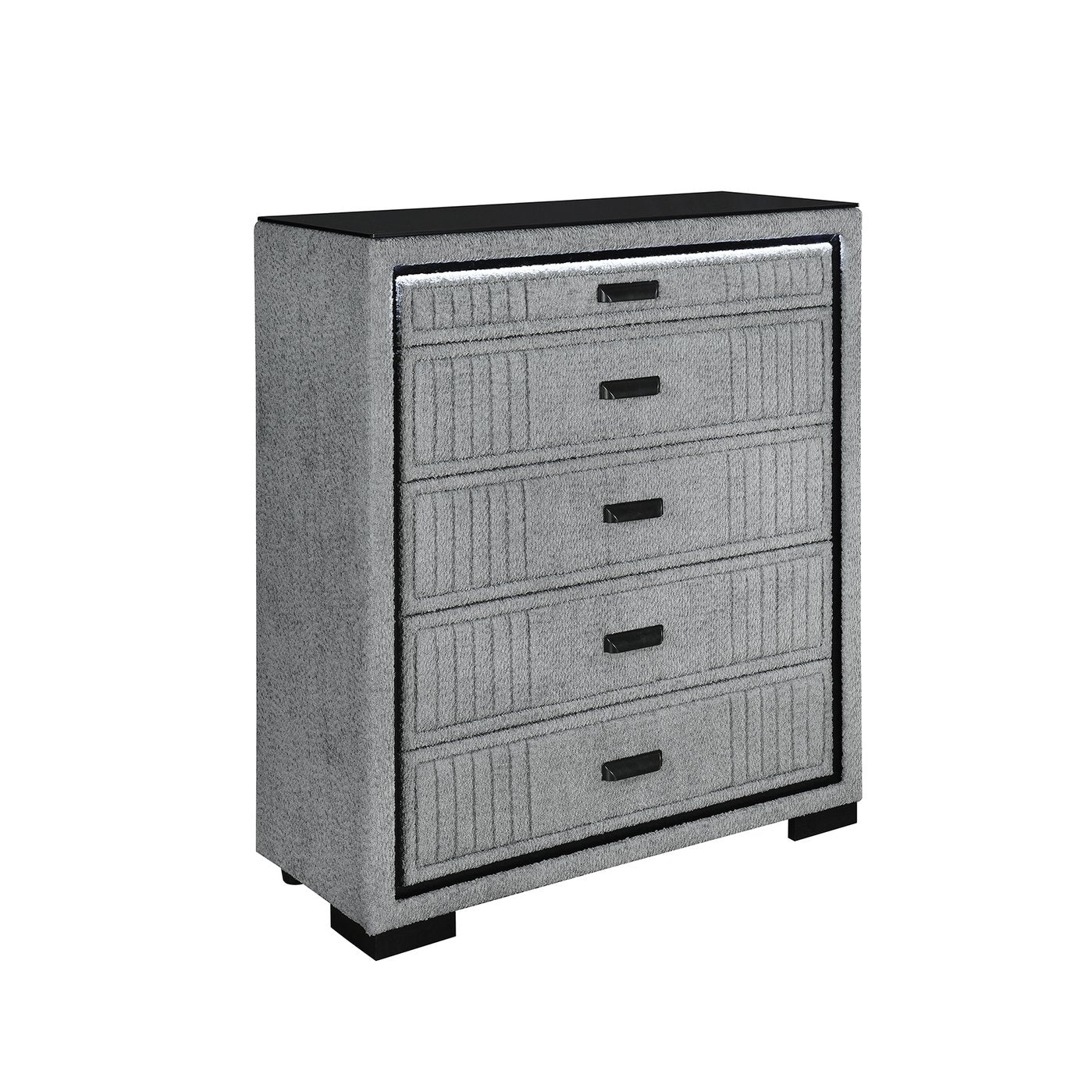 Bring modern comfort and practical storage to your bedroom with this elegantly upholstered gray chest. Its solid wood and MDF construction, clean block-style feet, and soft fabric frame create a refined, contemporary silhouette while generous drawers and integrated LED lighting make organization and visibility effortless.