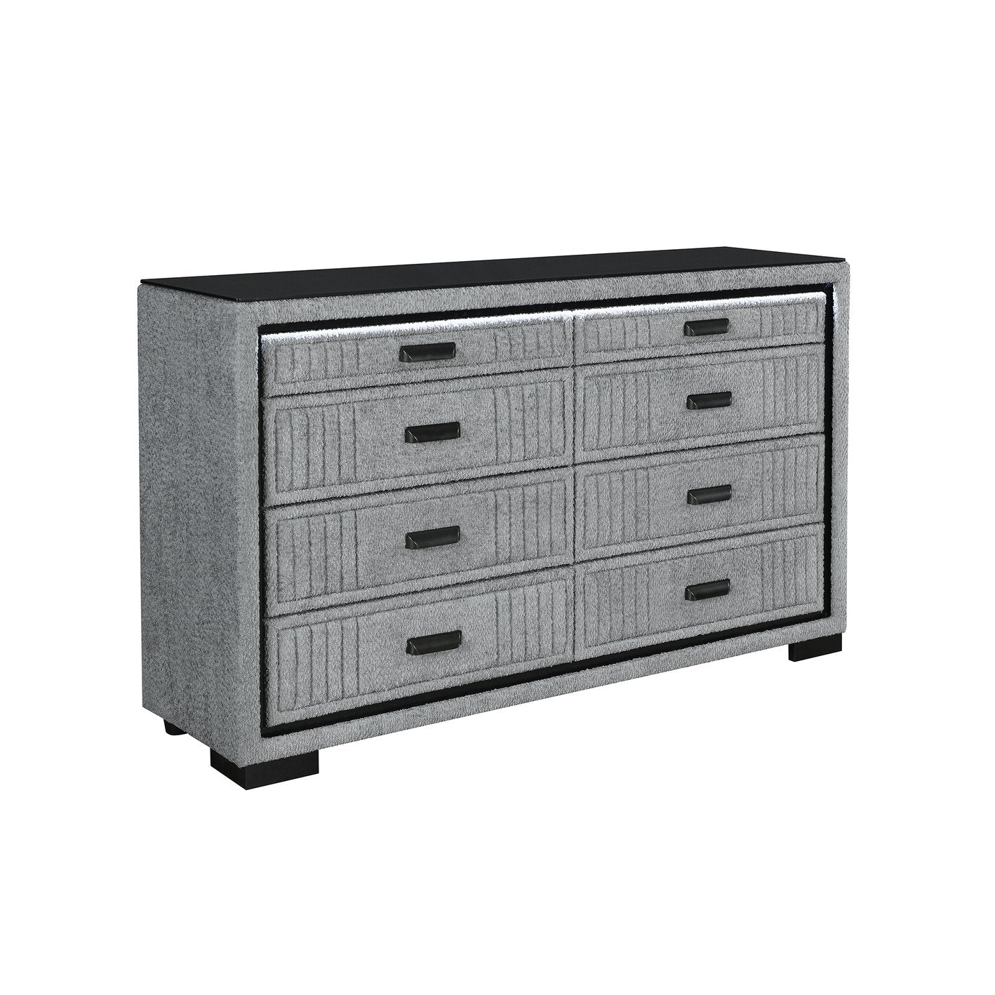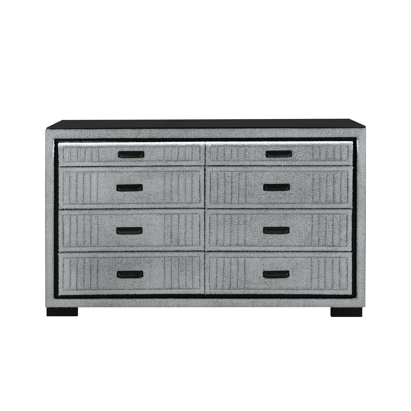 - Hardware: Matte black bar handles complement the gray upholstery for a contemporary contrast