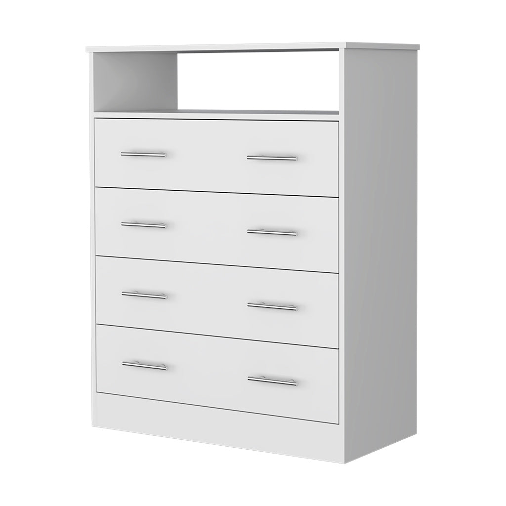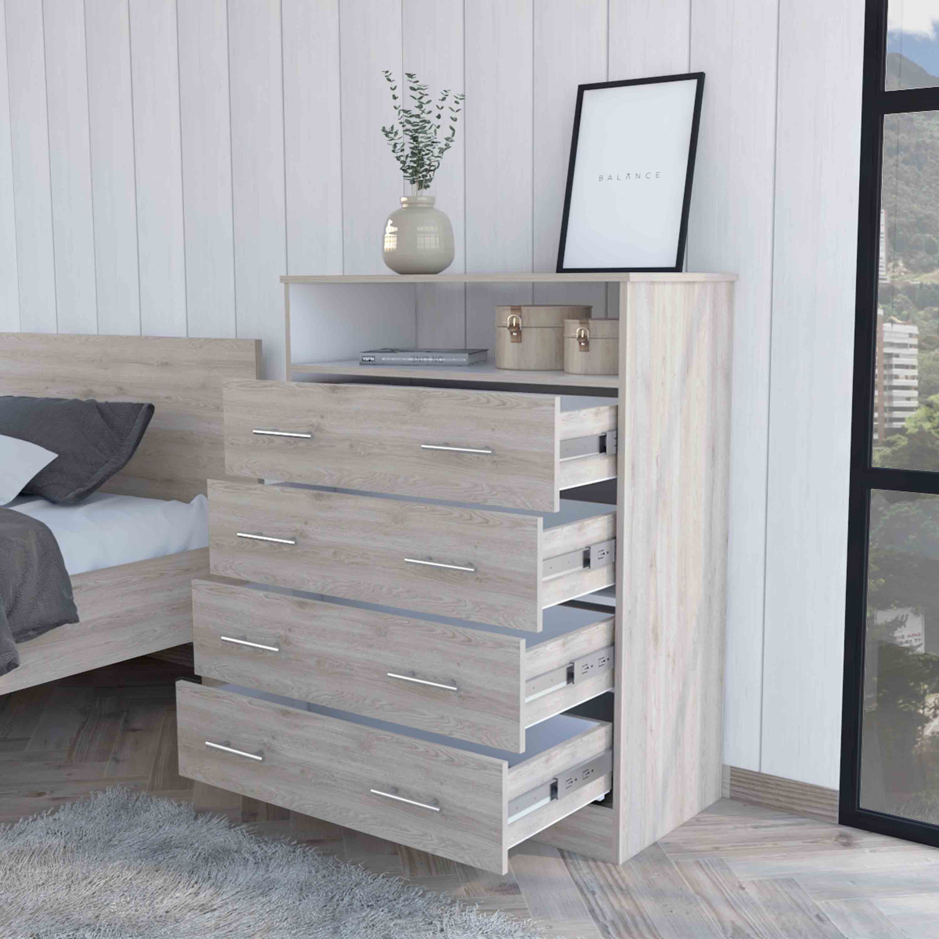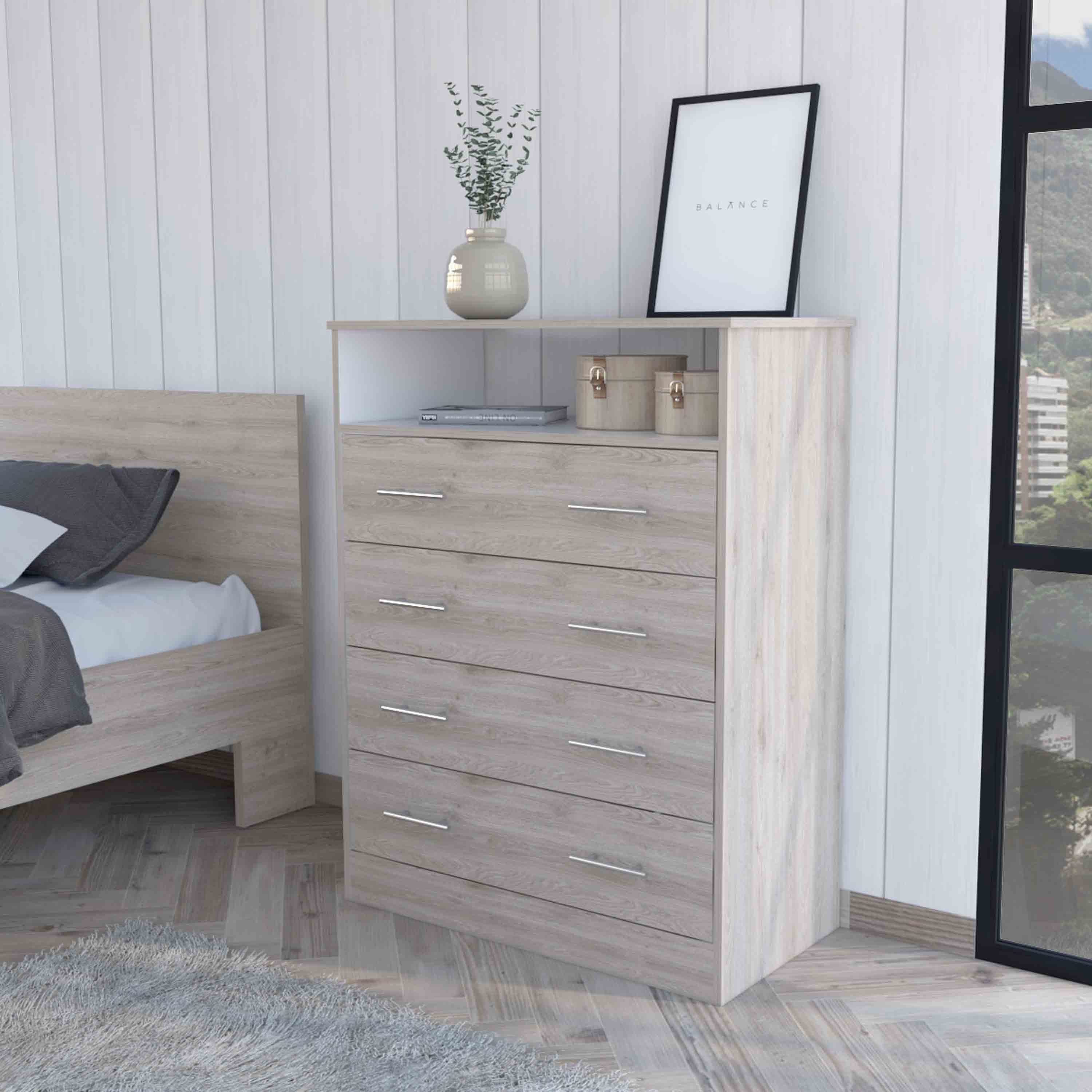 Bring modern simplicity and practical storage to any bedroom or living space with this Lagos four-drawer dresser. Finished in light grey and white with a durable superior top and clean lines, it blends contemporary style with everyday functionality—ideal for organizing clothing, linens, and accessories while providing an attractive surface for décor.