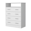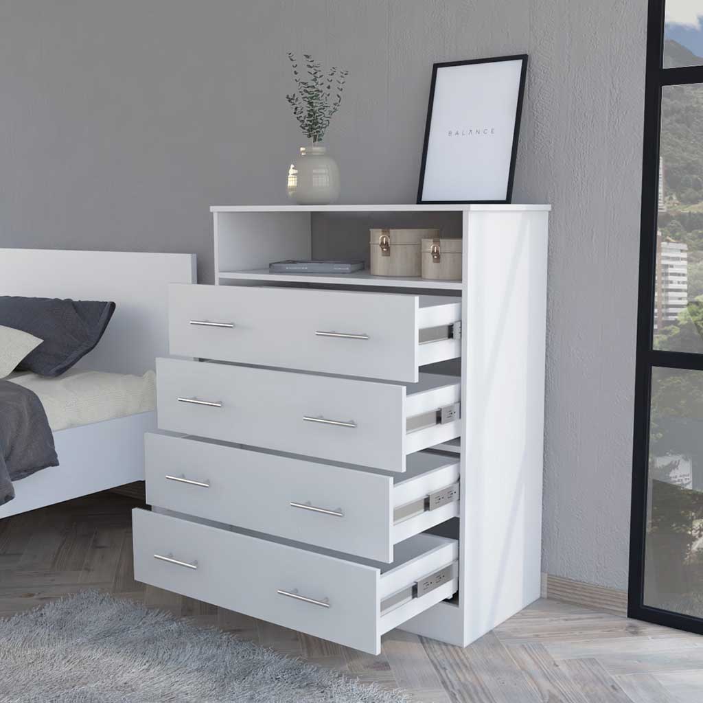 - Storage configuration: four smooth-glide drawers plus one open shelf for easy access items