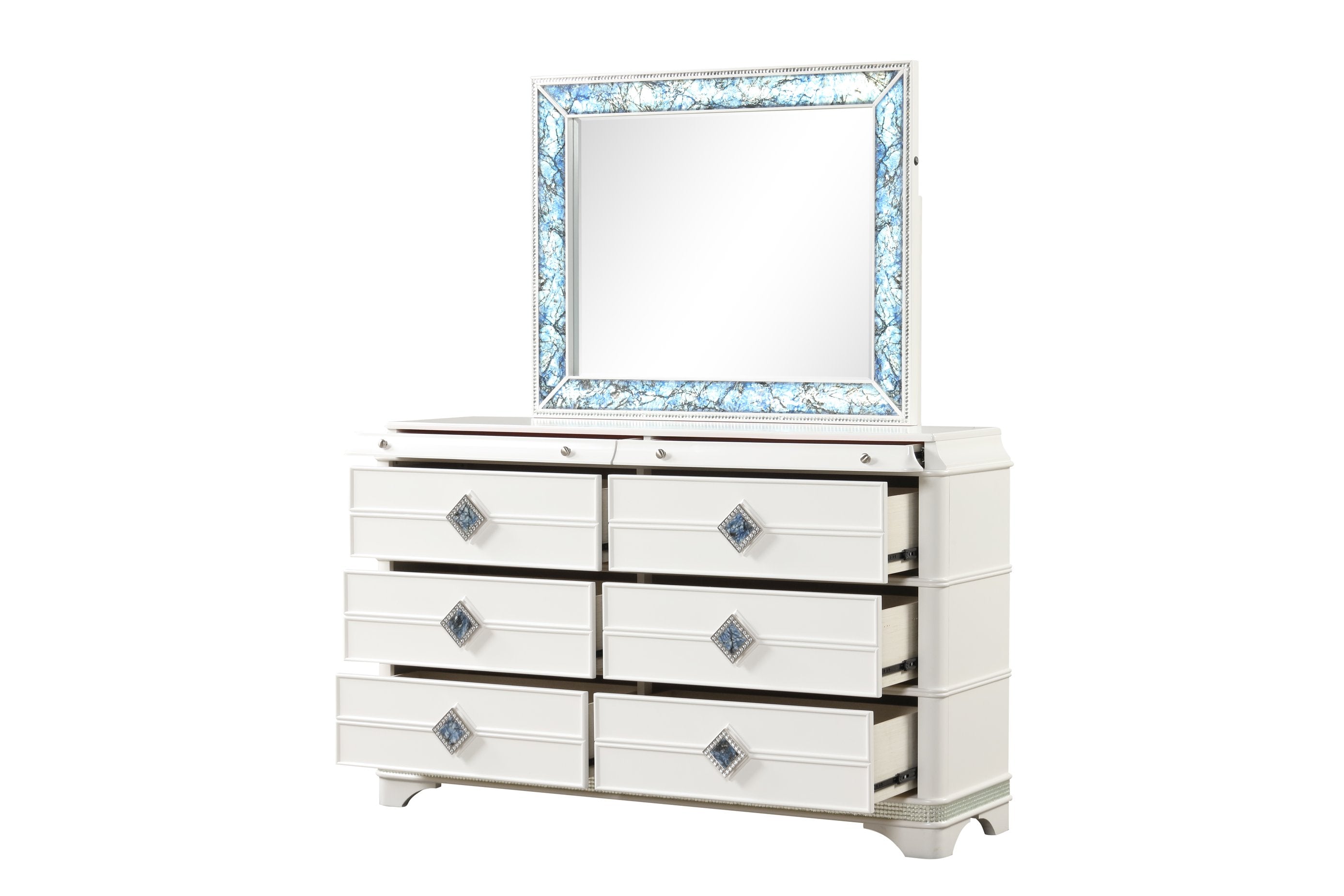 Elevate your bedroom with this modern Laguna 6-drawer dresser — a refined blend of contemporary design and practical storage. Crafted for everyday use, it pairs clean white wood construction with eye-catching crystal accents and translucent blue marble-style drawer centers to create a luxurious focal point. Soft-closing drawers and a hidden jewelry compartment deliver quiet, organized convenience while the sturdy build ensures lasting performance.