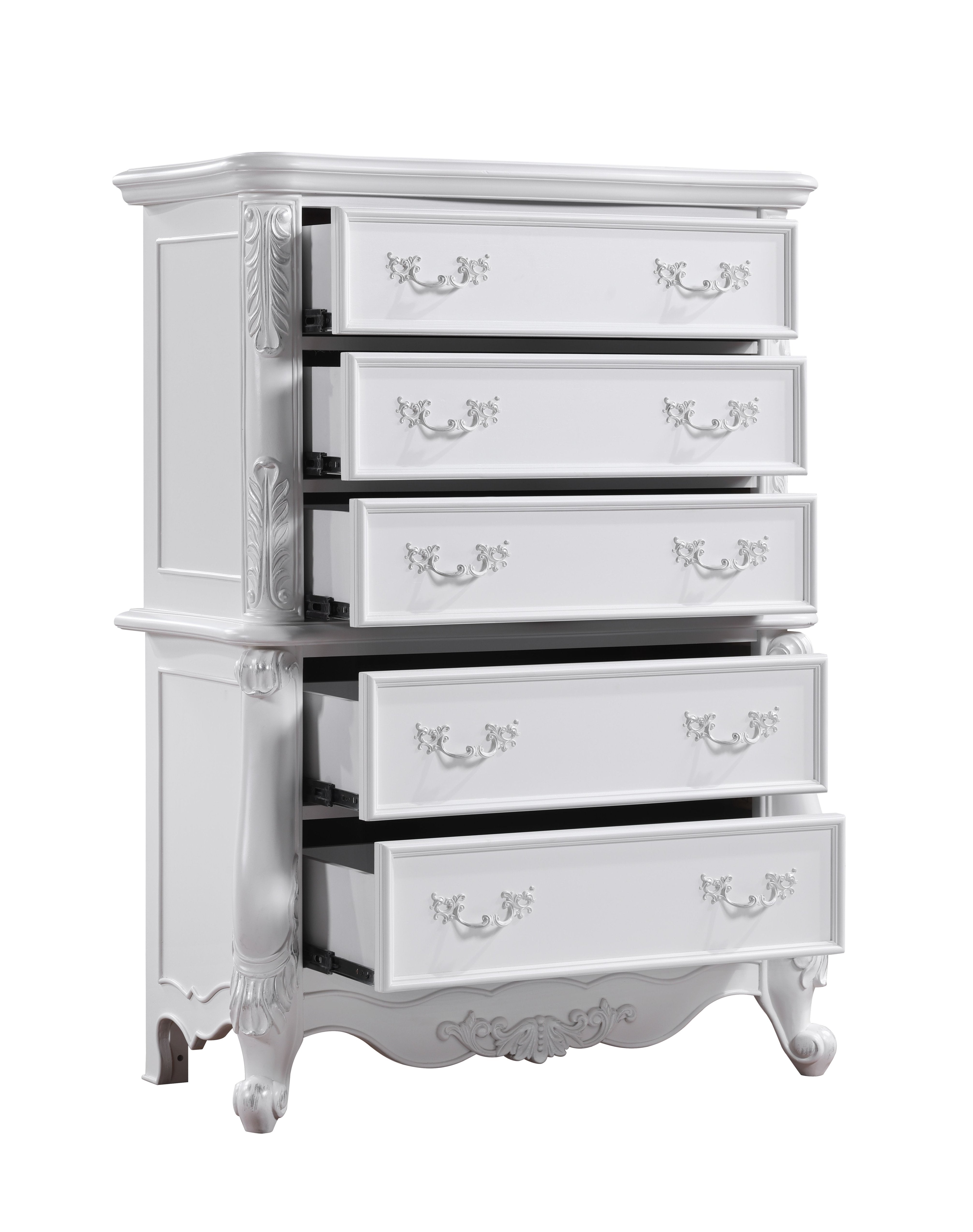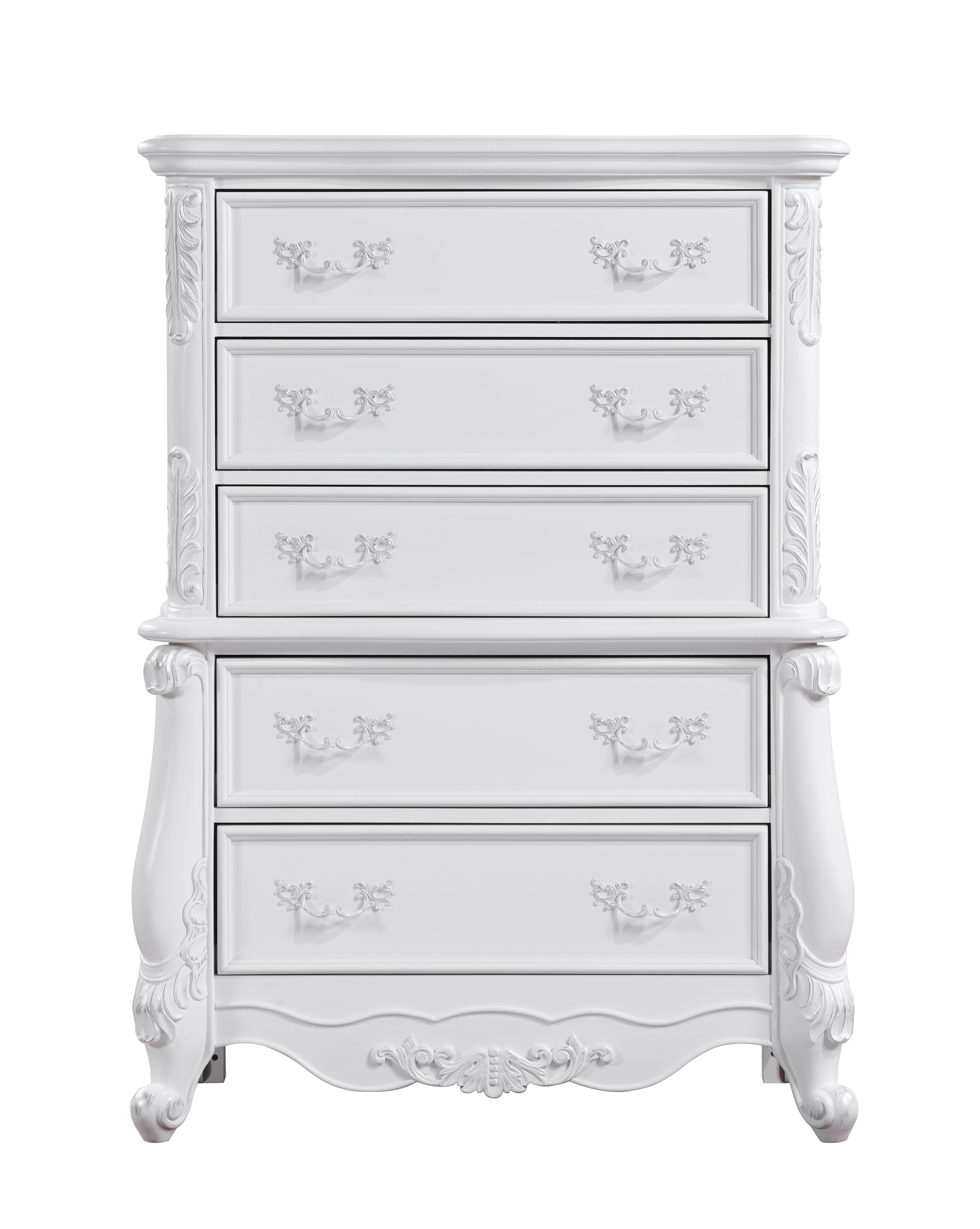 Elevate your bedroom with the Latisha dresser in a crisp white finish—an elegant, practical centerpiece designed to organize clothing and accessories while complementing modern and traditional decor. Built from durable hardwood, MDF, and composite wood with a paper veneer finish, this dresser delivers lasting stability and a refined look that enhances any space.
