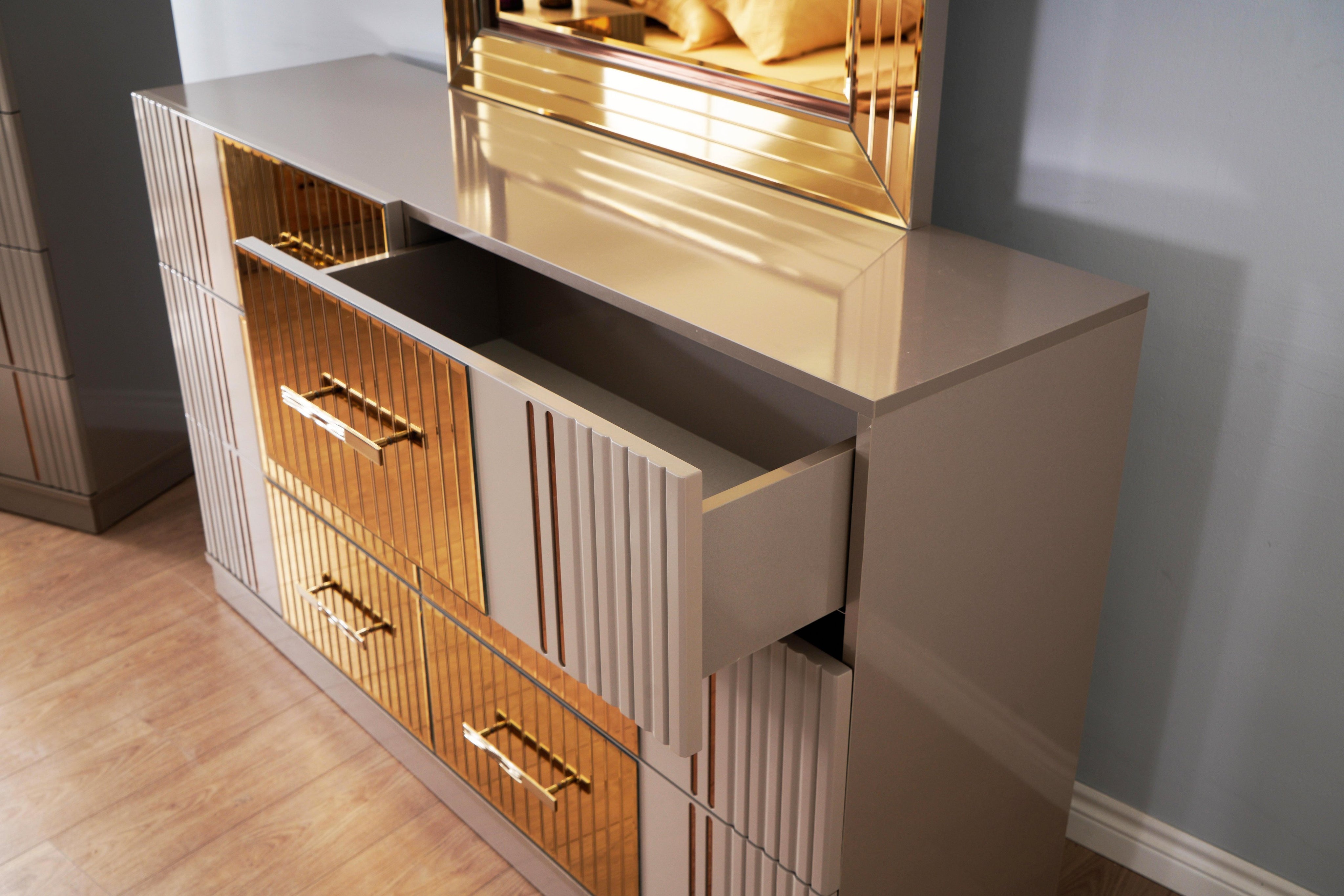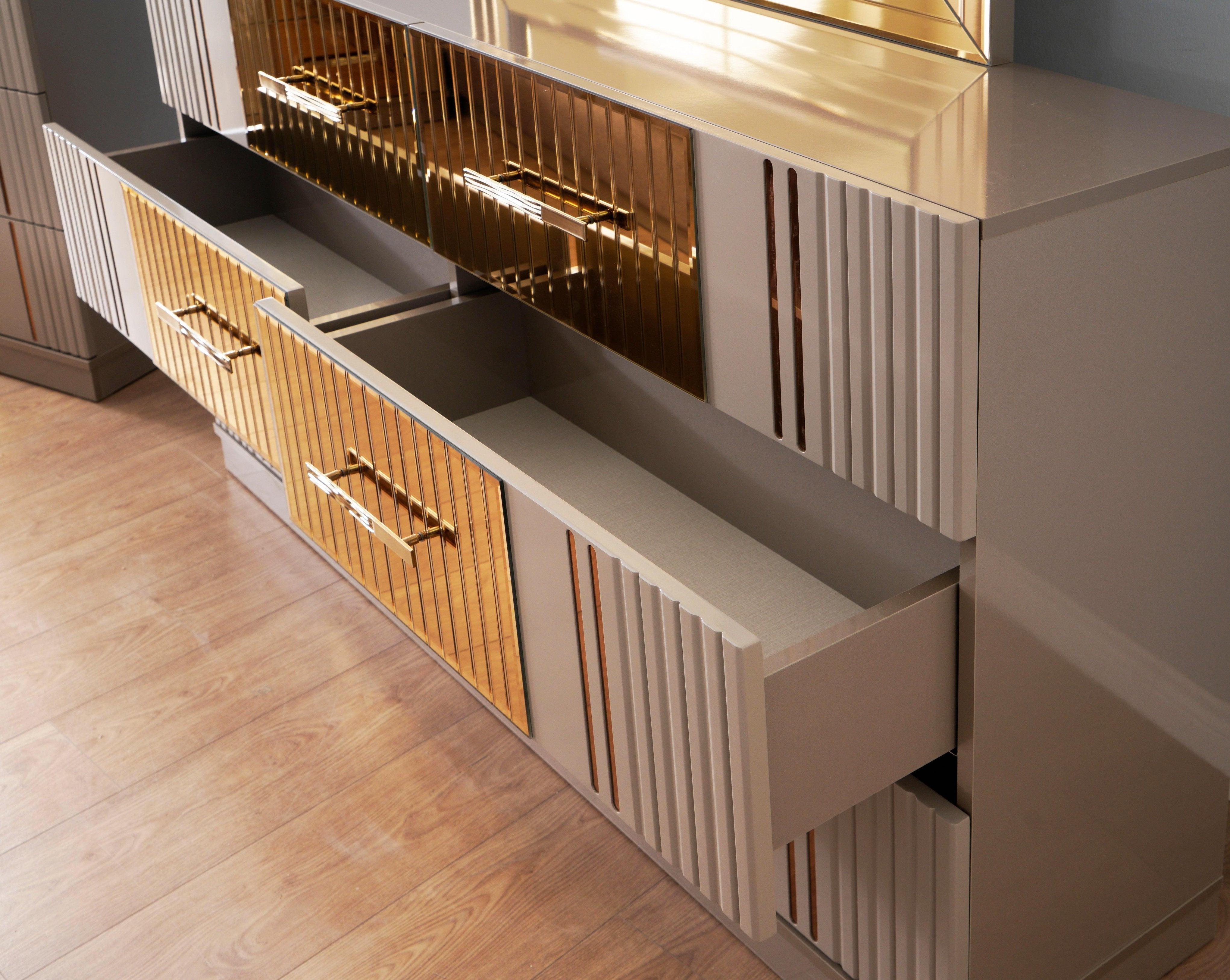 - Accents: Bronze mirror detailing enhances the dresser’s luxe appearance and catches light for visual interest