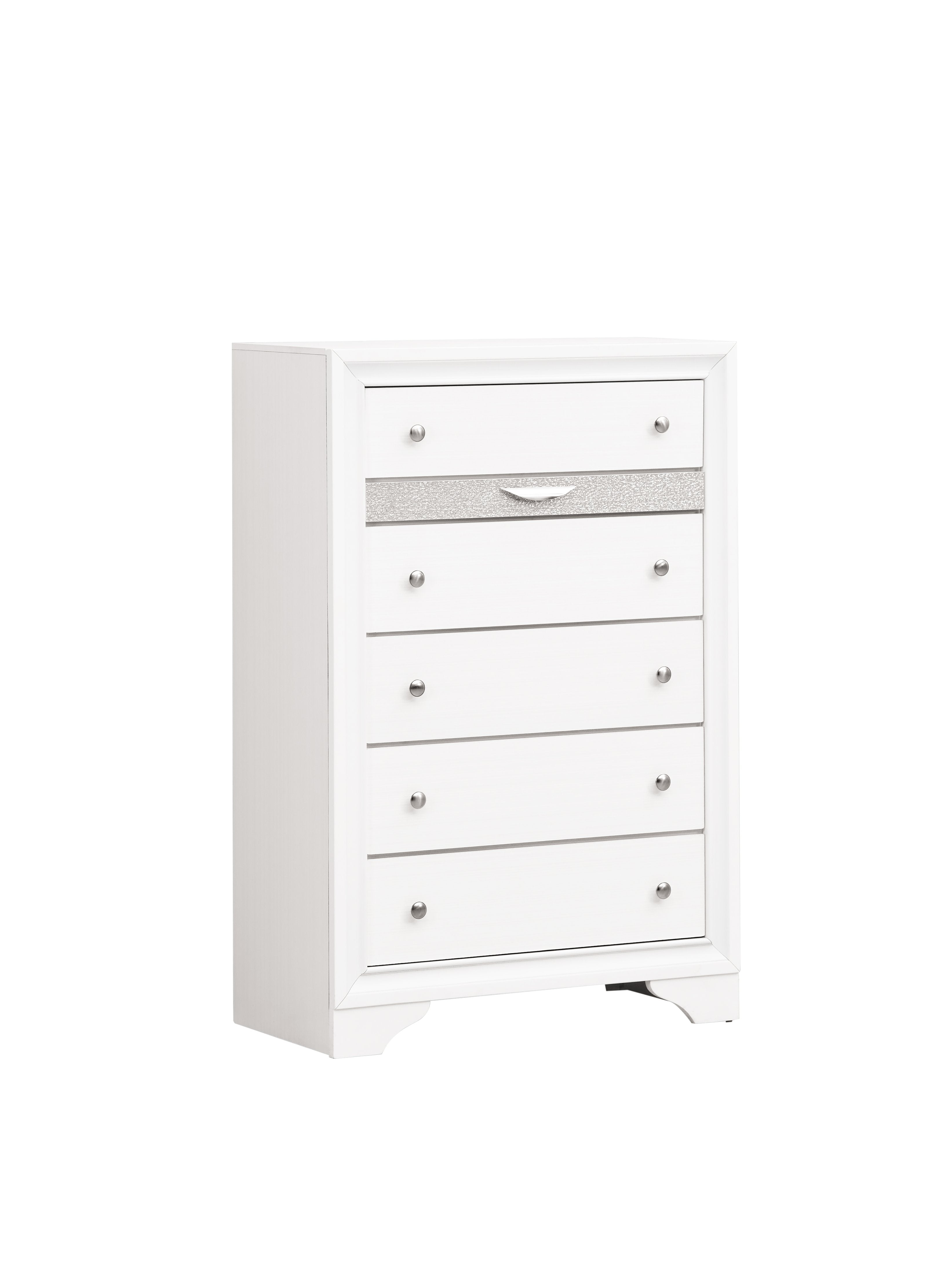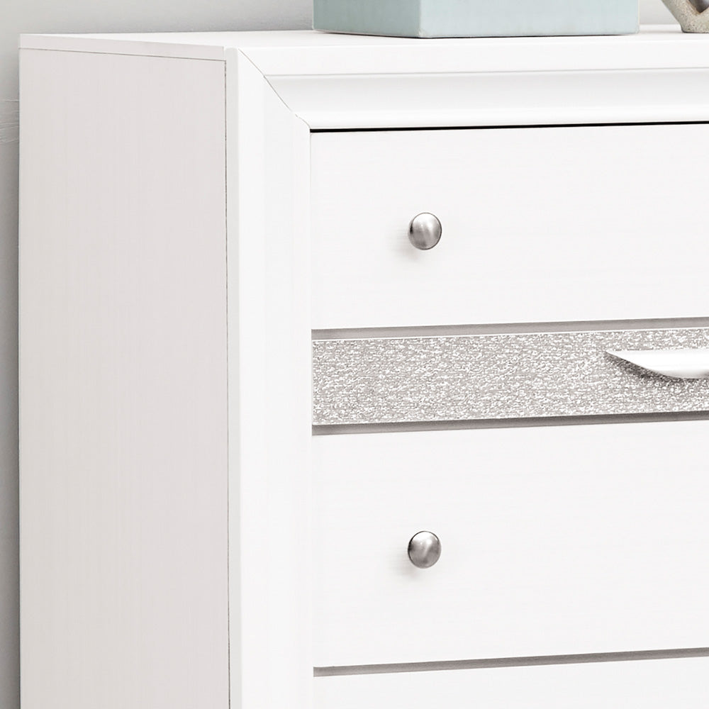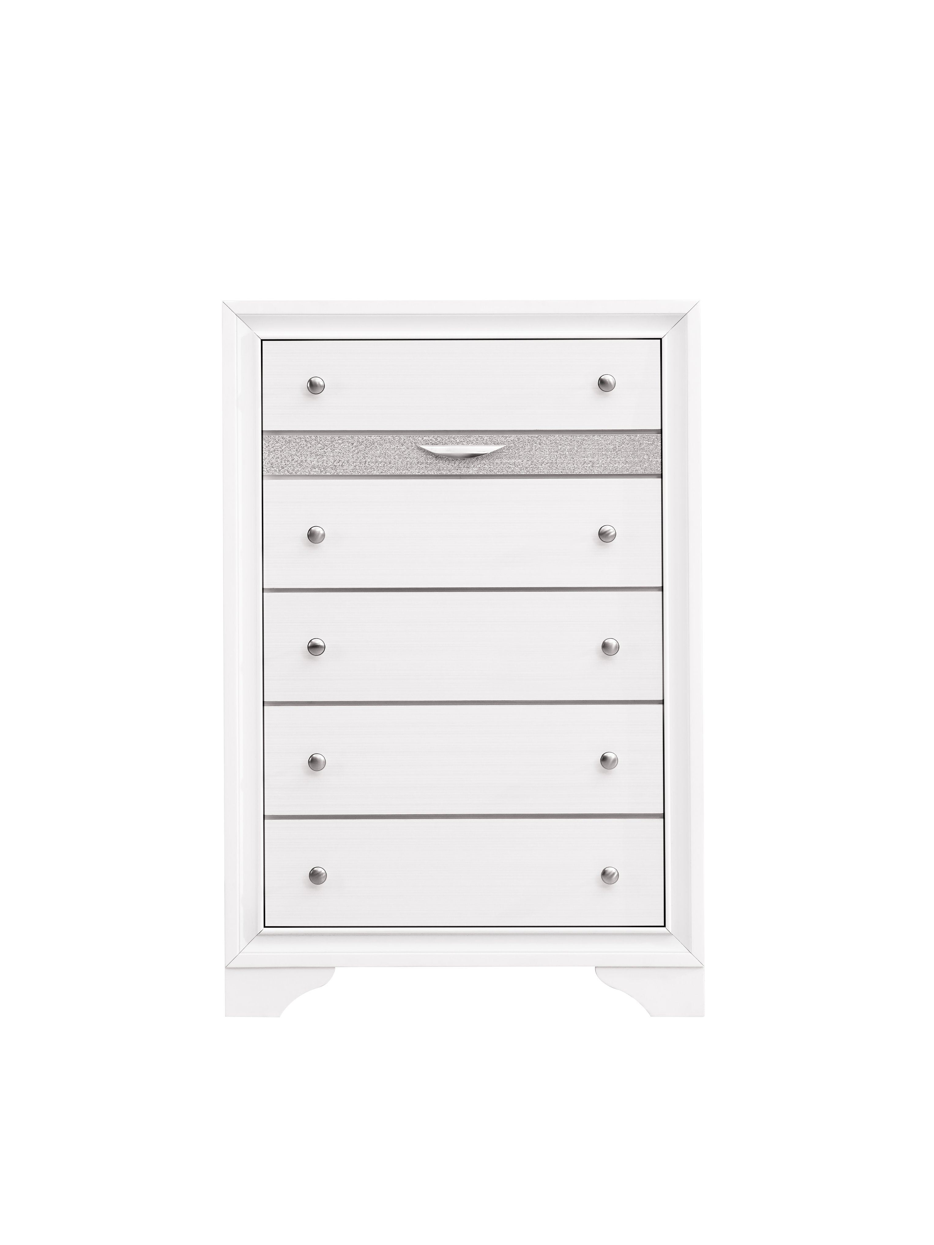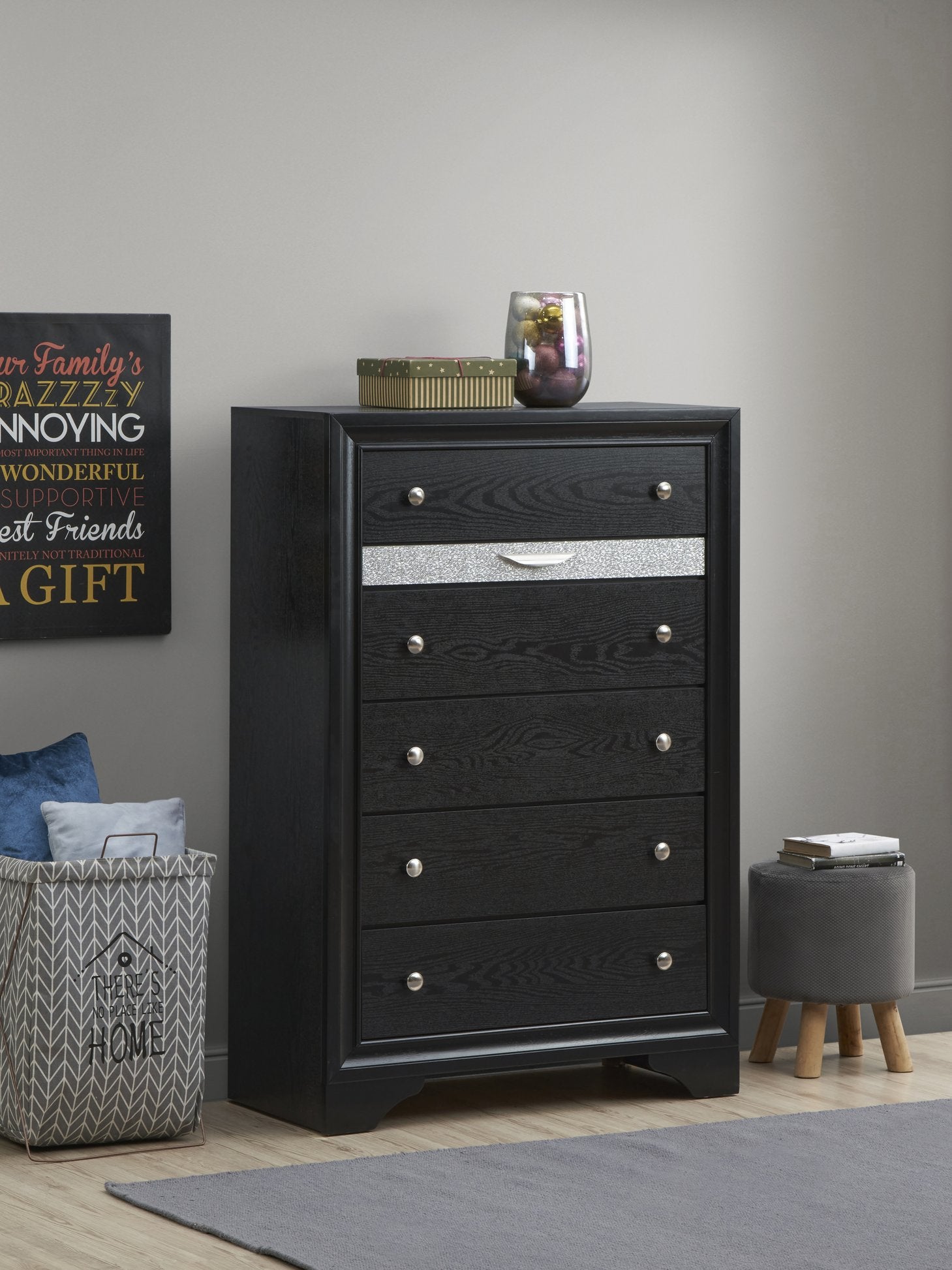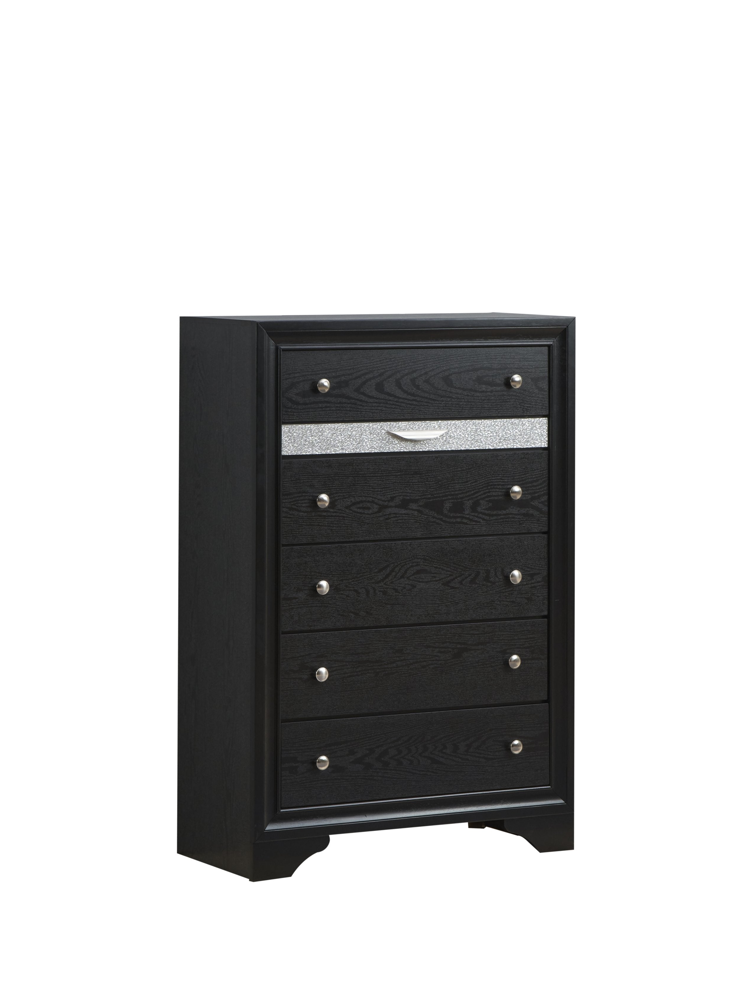 Elevate your bedroom or living space with this modern 6-drawer chest that combines refined style and practical storage. Designed with a contemporary laminate wood grain finish and striking black color, it delivers a polished look while built for everyday use. Thoughtful details—like a felt-lined accessory drawer, full-extension glides, and a silver acrylic trim that mimics crystal—bring both convenience and visual interest to your home.