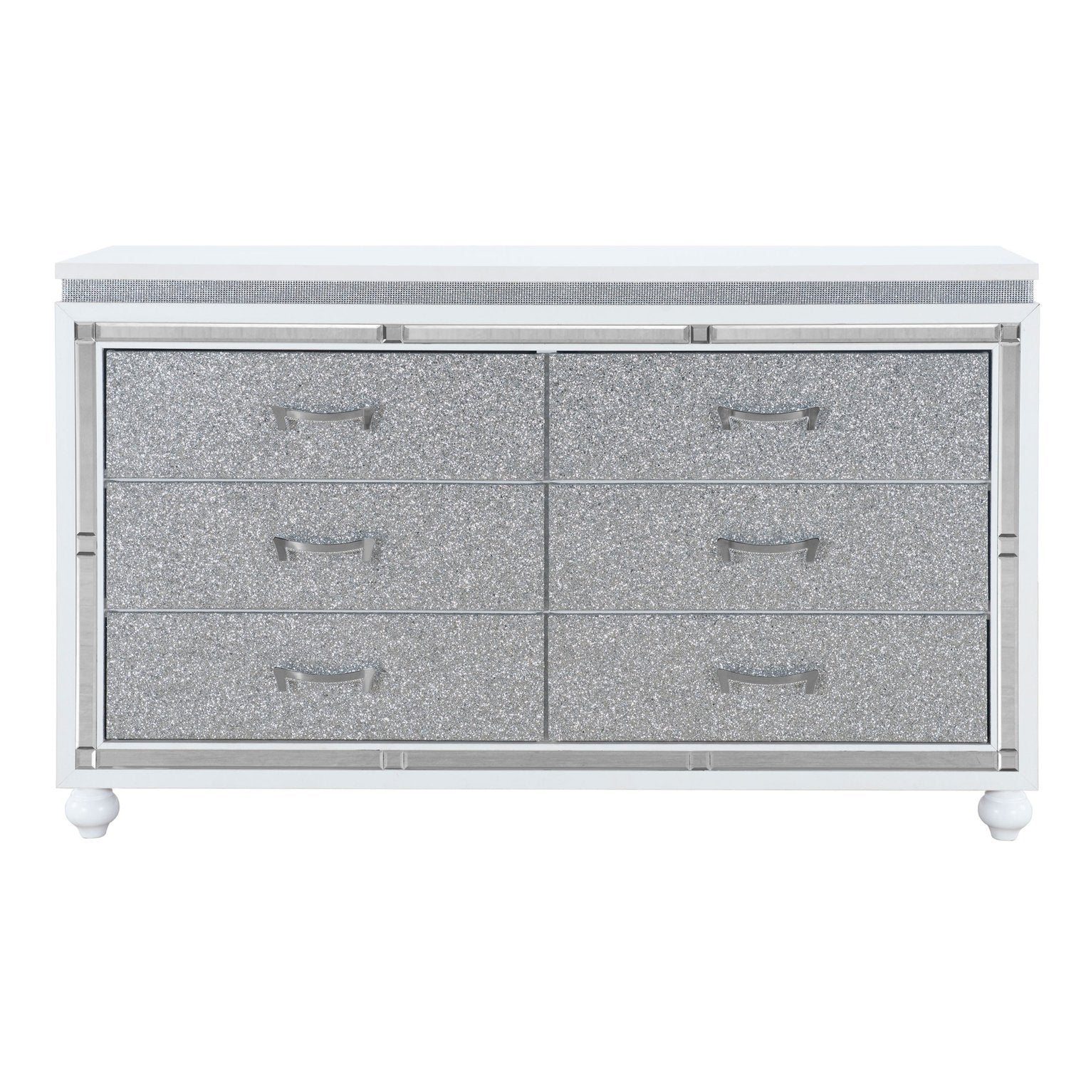 Elevate your bedroom with a contemporary glam dresser that blends sturdy construction and sparkling details. This piece pairs solid wood and MDF durability with mirrored and crystal-crushed accents to create a refined focal point that’s both functional and stylish. Ideal for those who want luxe flair without sacrificing everyday practicality.