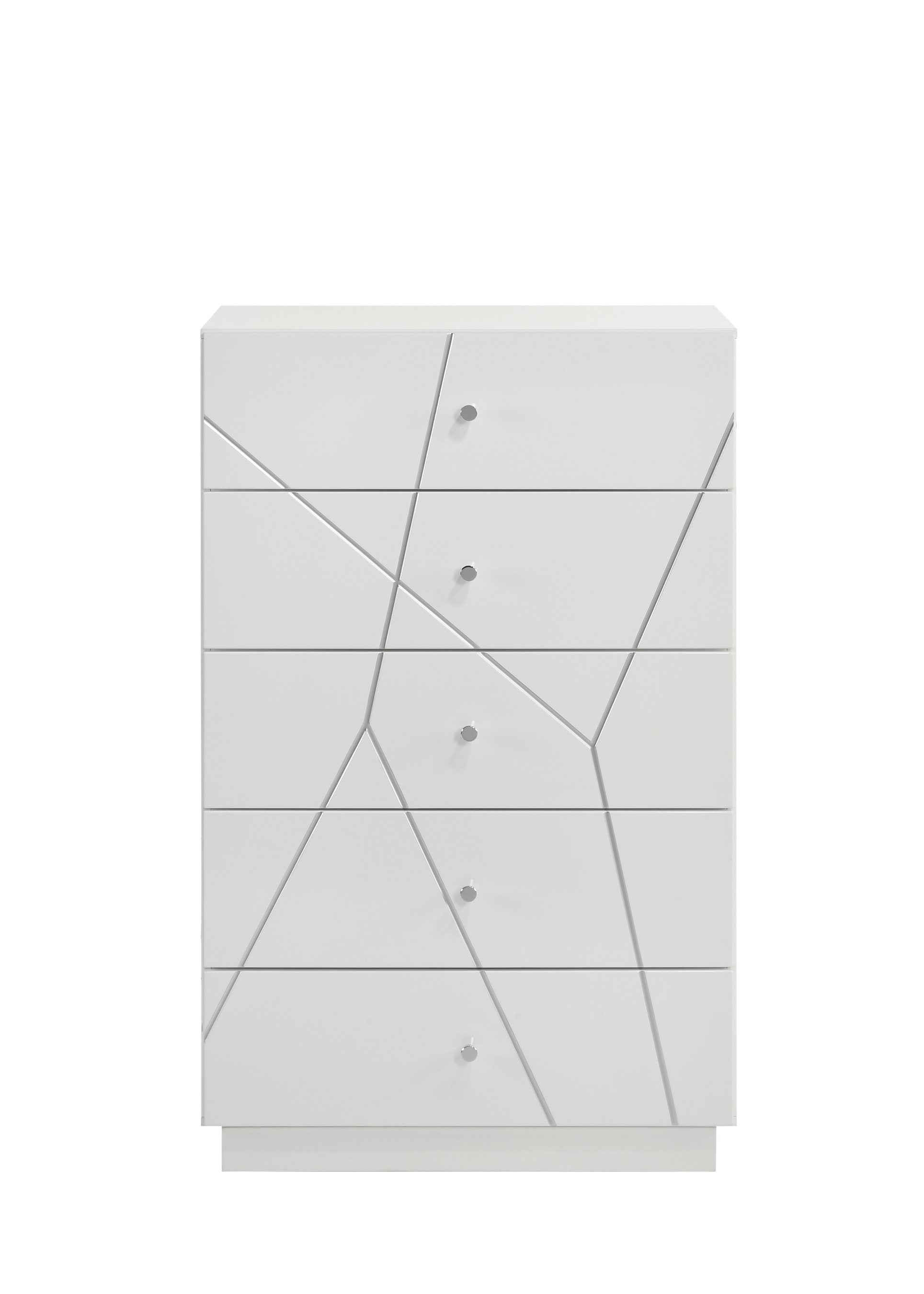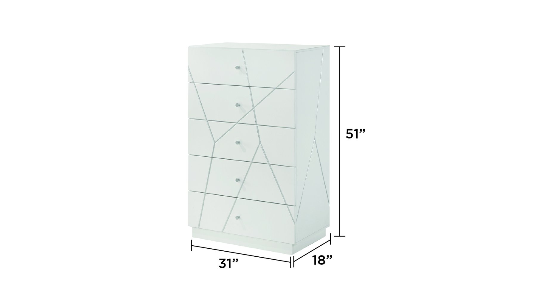 Elevate your bedroom with a modern statement piece that combines clean lines, sculptural geometry, and practical storage. The lacquered finish reflects light for a bright, contemporary look while the geometric front panels add depth and visual interest. Designed for everyday use, this chest pairs refined style with durable construction and smooth-operating drawers to keep clothing and linens neatly organized.