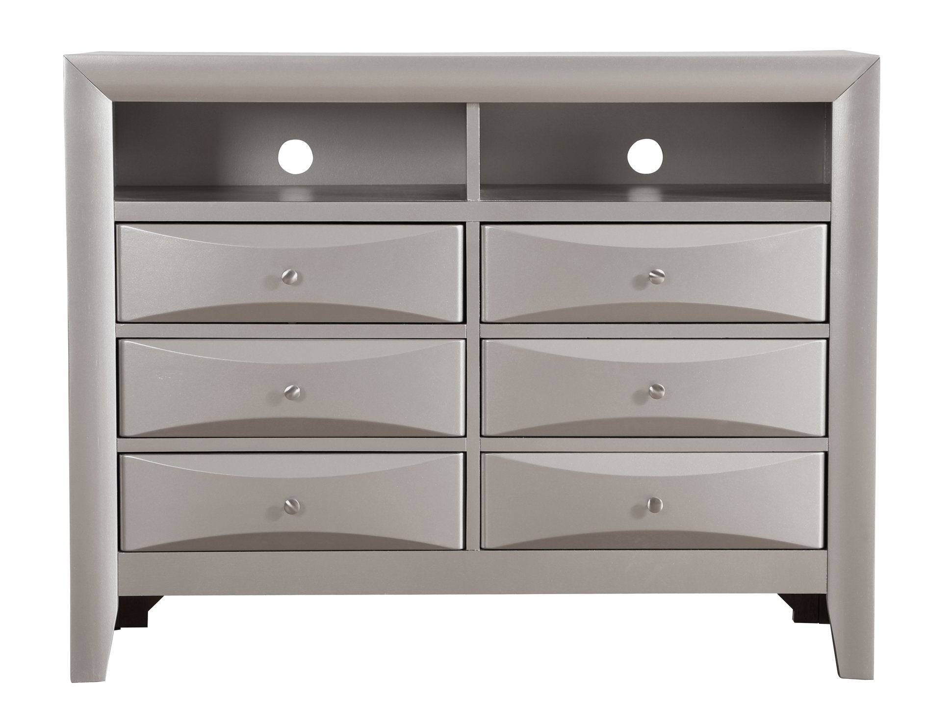 Elevate your media area with the Marilla G1503-TV2 Media Chest in Silver Champagne — a stylish, durable storage solution that blends modern design with practical features. Its refined champagne finish and textured veneer detail bring warmth to any room while offering organized storage for media components, accessories, and more.