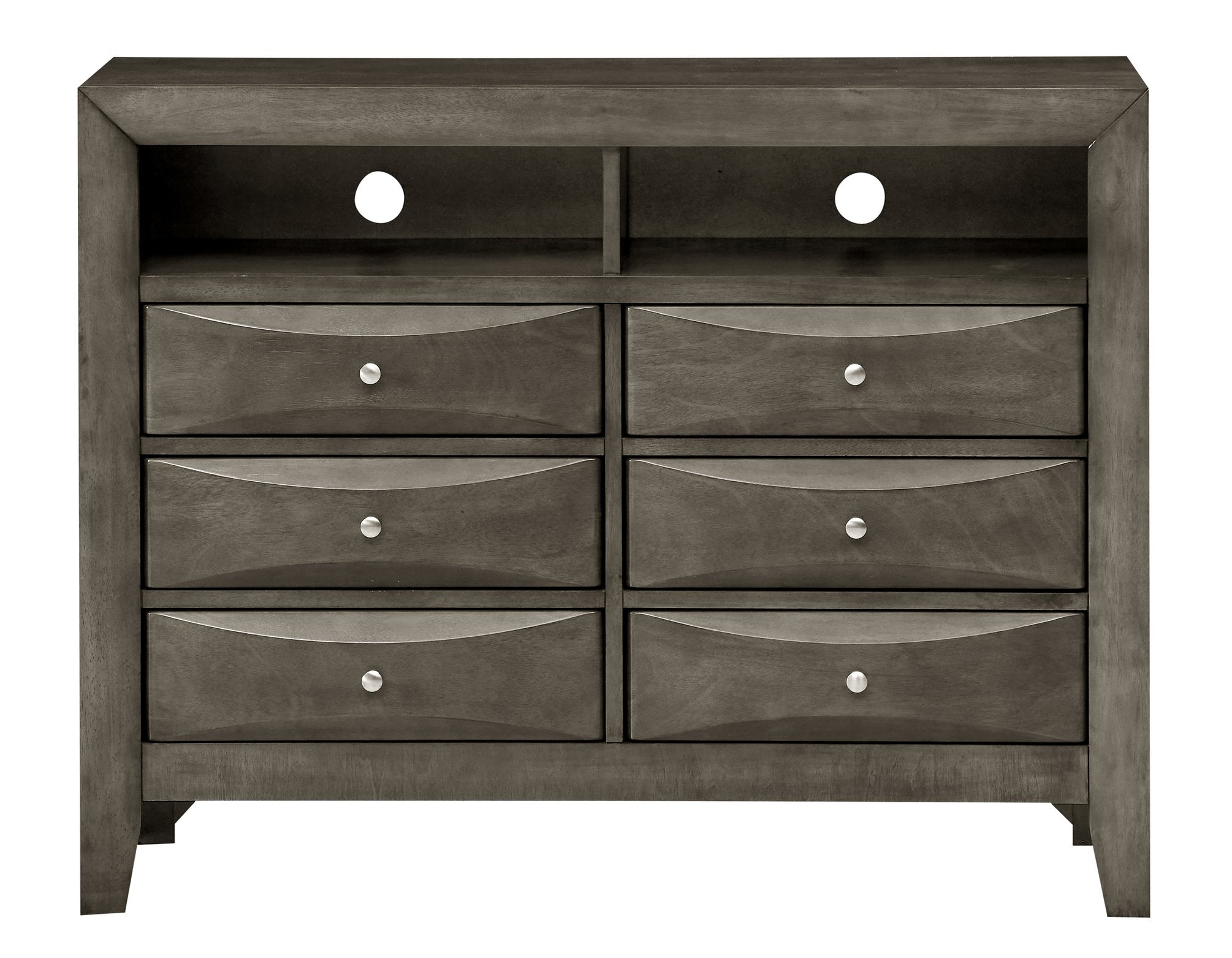 Give your bedroom a modern, streamlined centerpiece with this gray media chest. Designed for both style and durability, it pairs molded resin beveled drawer fronts with real wood veneers for an upscale look, while robust construction details ensure long-lasting performance and easy everyday use.