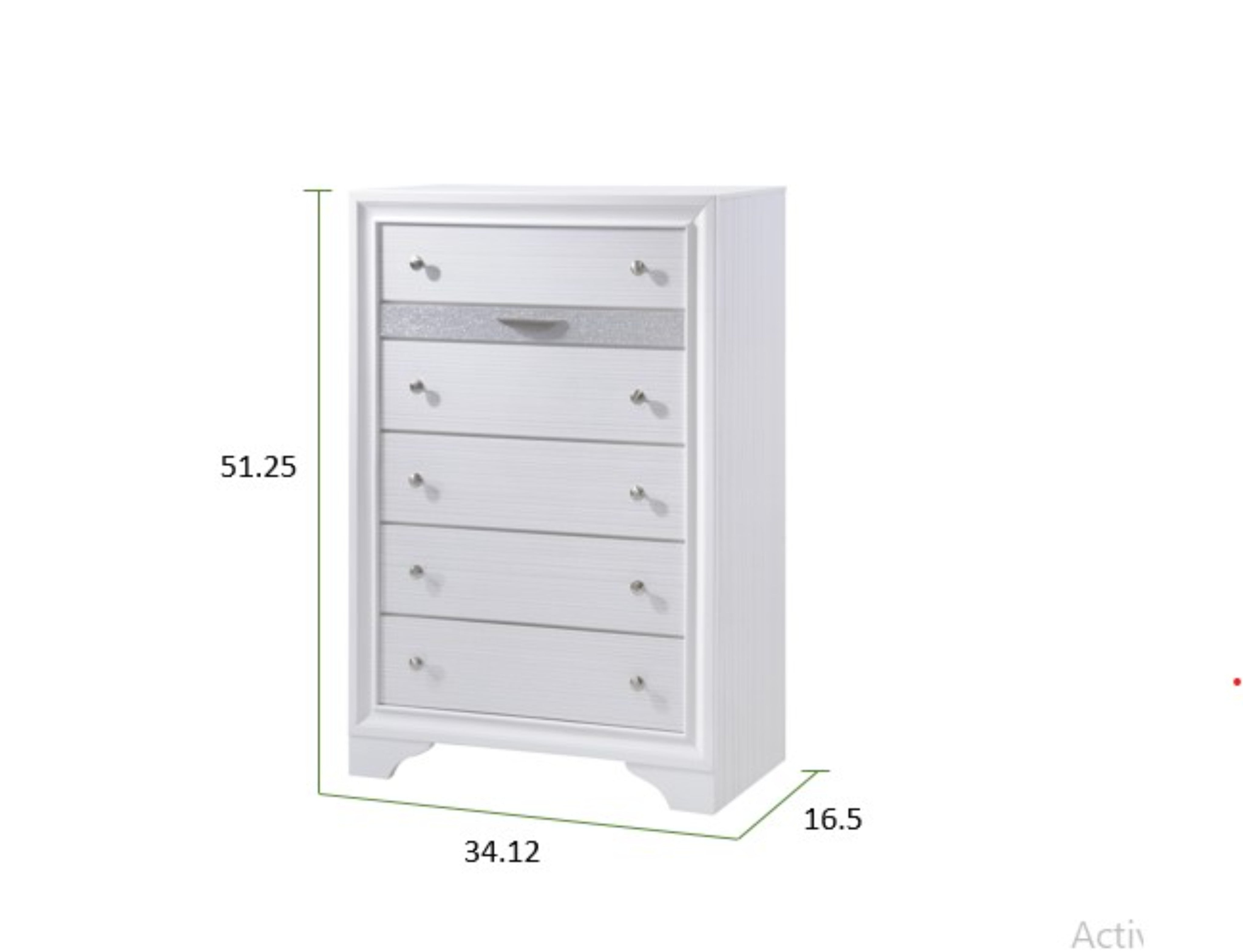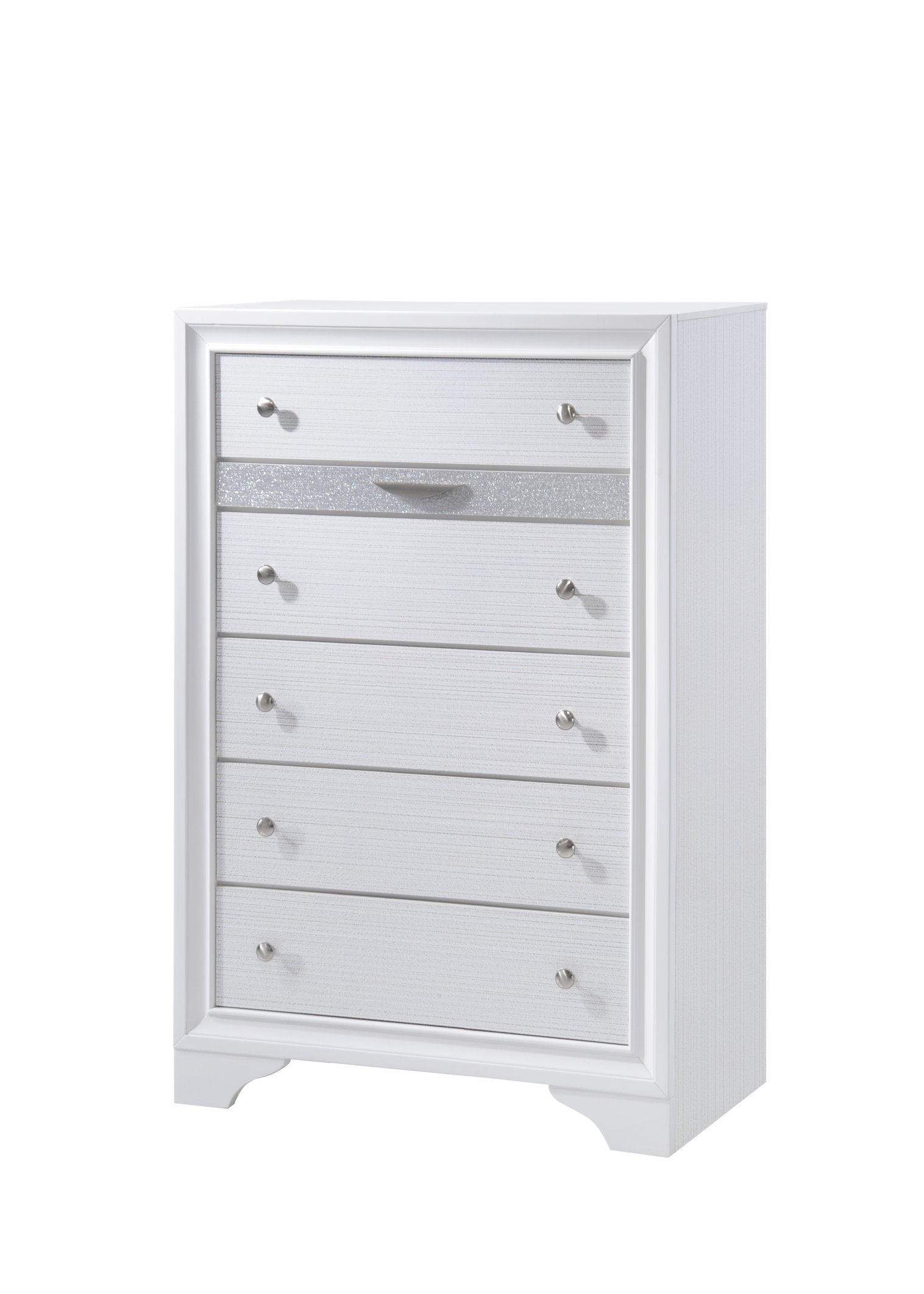 Bring classic charm and reliable storage to your bedroom with this traditional five-drawer wood chest. Its clean white finish and silver knob pulls blend elegance with everyday practicality, offering versatile organization for clothing and accessories while providing a polished focal point for your room.