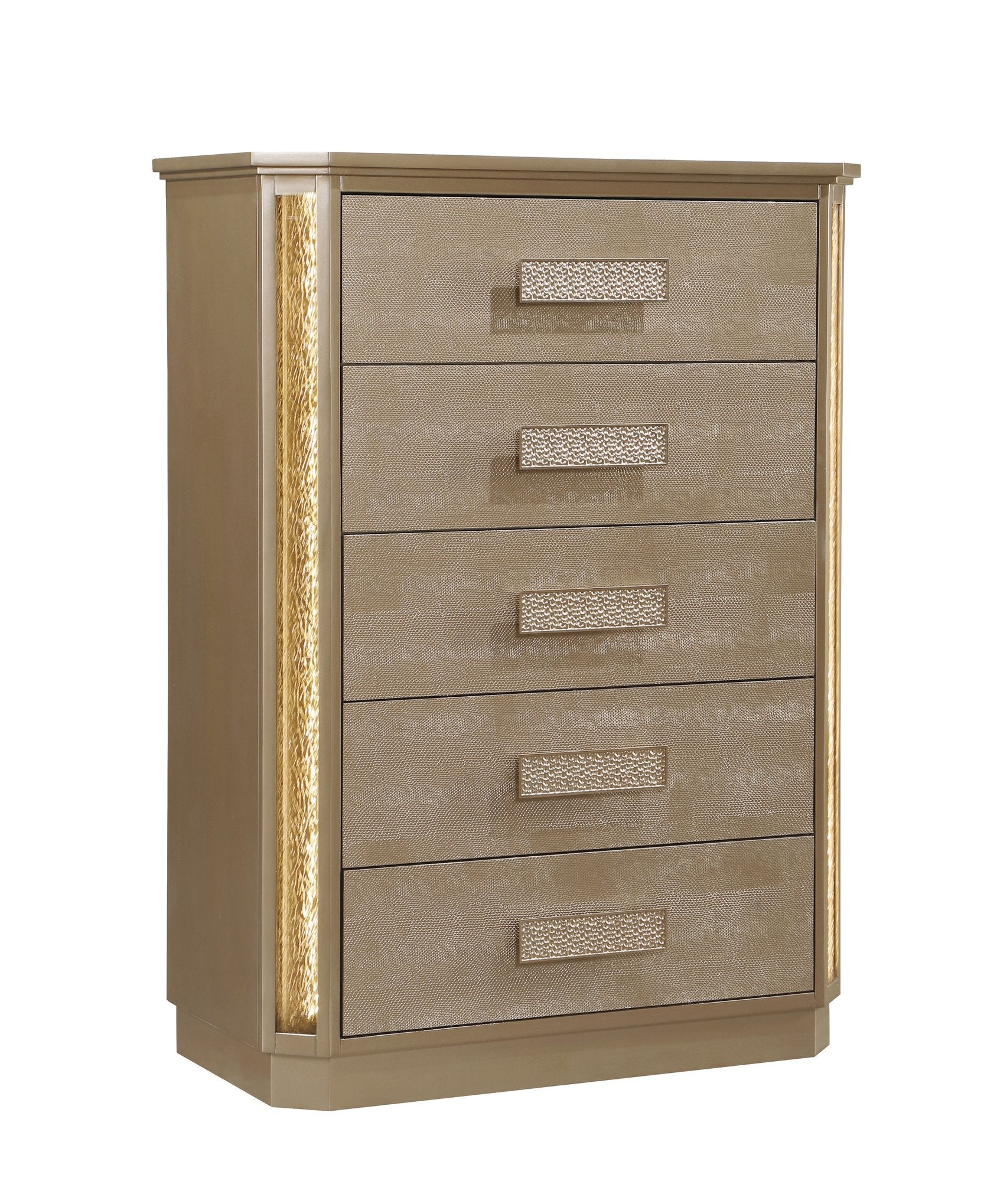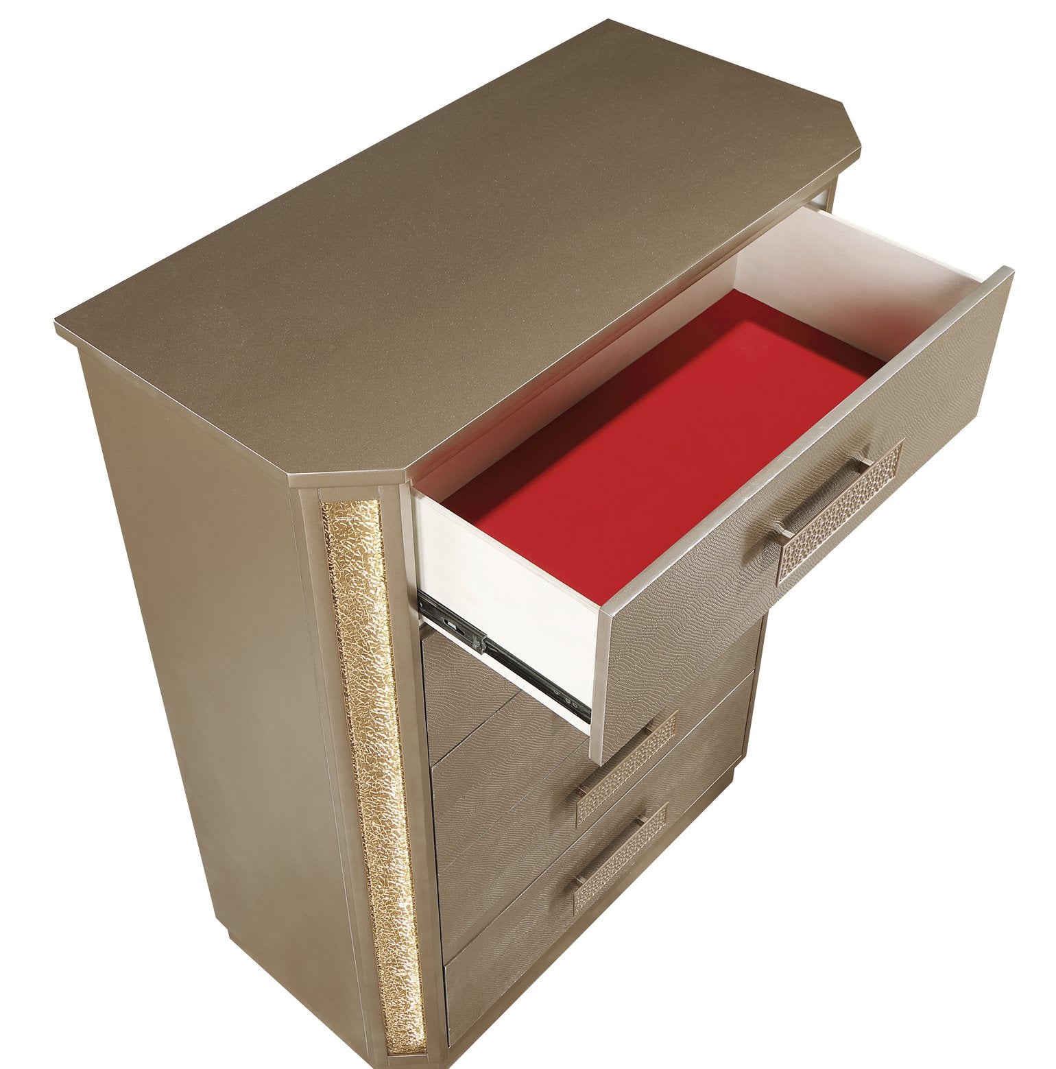 Elevate your bedroom with a statement storage piece that blends bold glamour and practical organization. This Medusa-inspired 5-drawer chest combines high-impact metallic finishes and textured details with thoughtful features—perfect for adding luxe character while keeping essentials neatly stored.