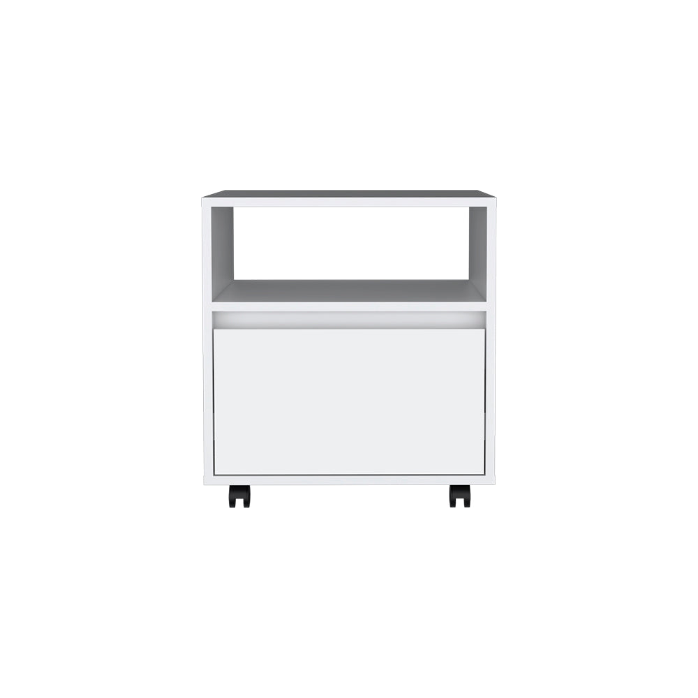 - The Munyoch Nightstand is equipped with casters for easy mobility and positioning.