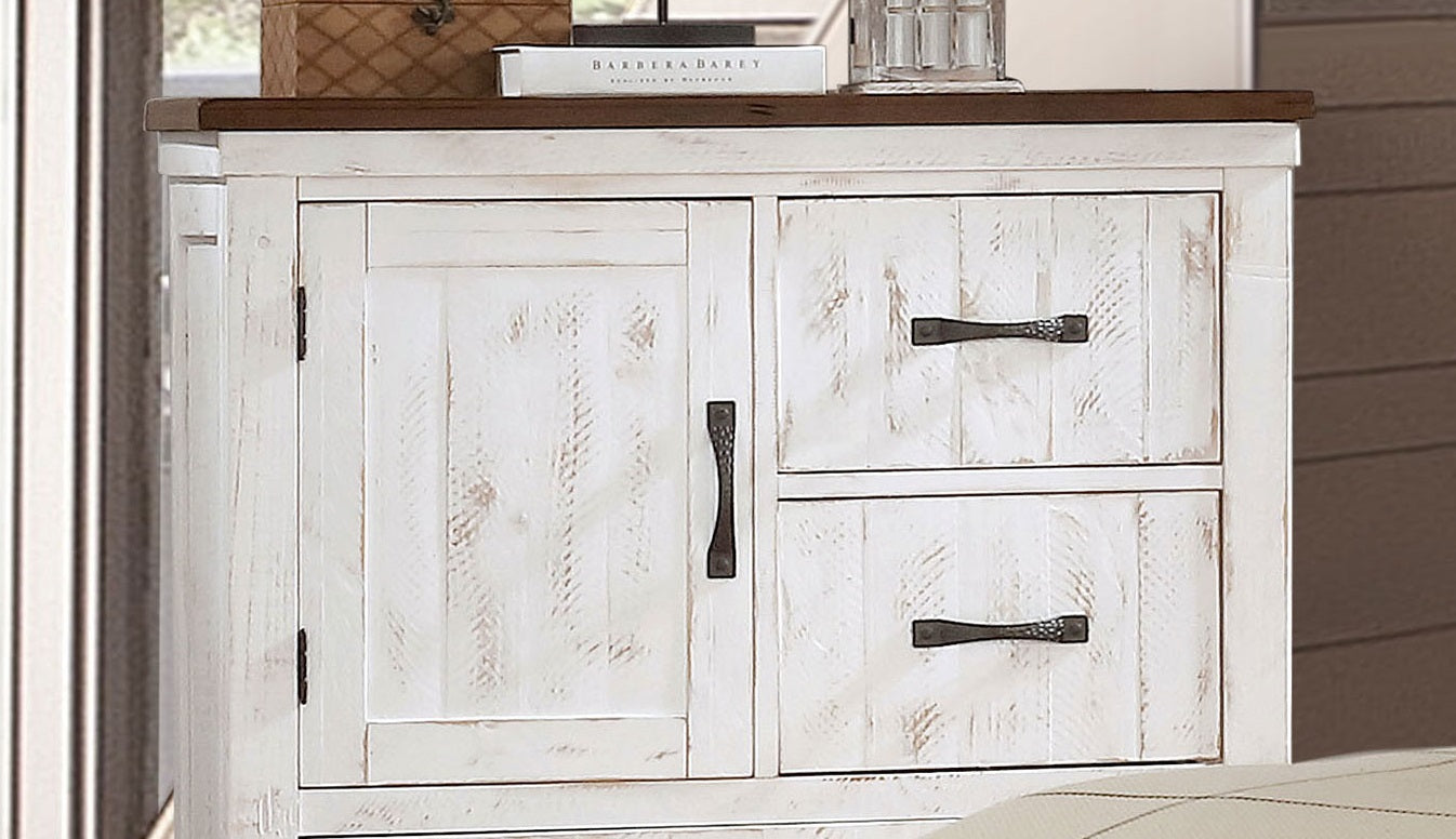 - Finish: Distressed white with walnut plank accents for a vintage-inspired, two-tone look.