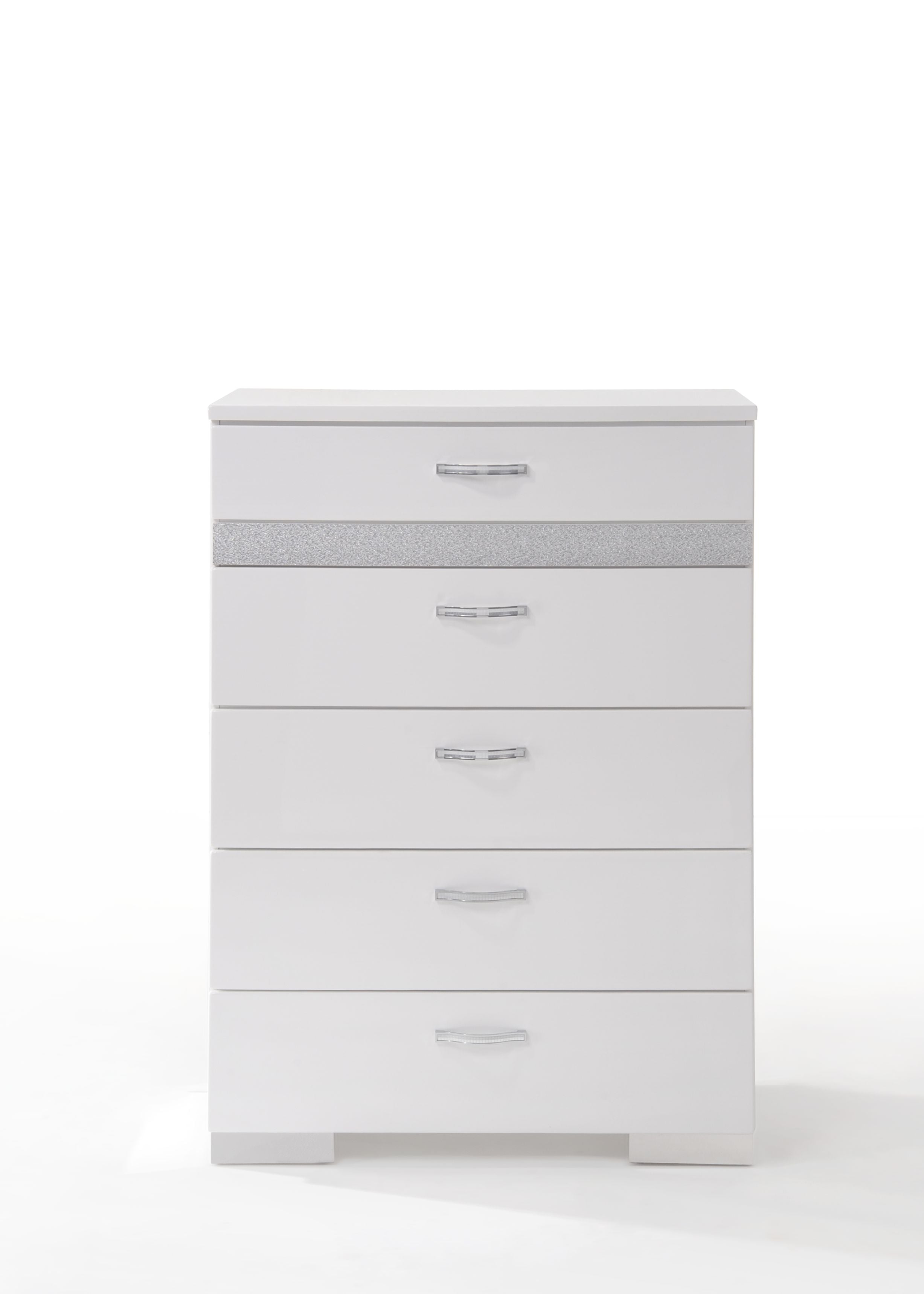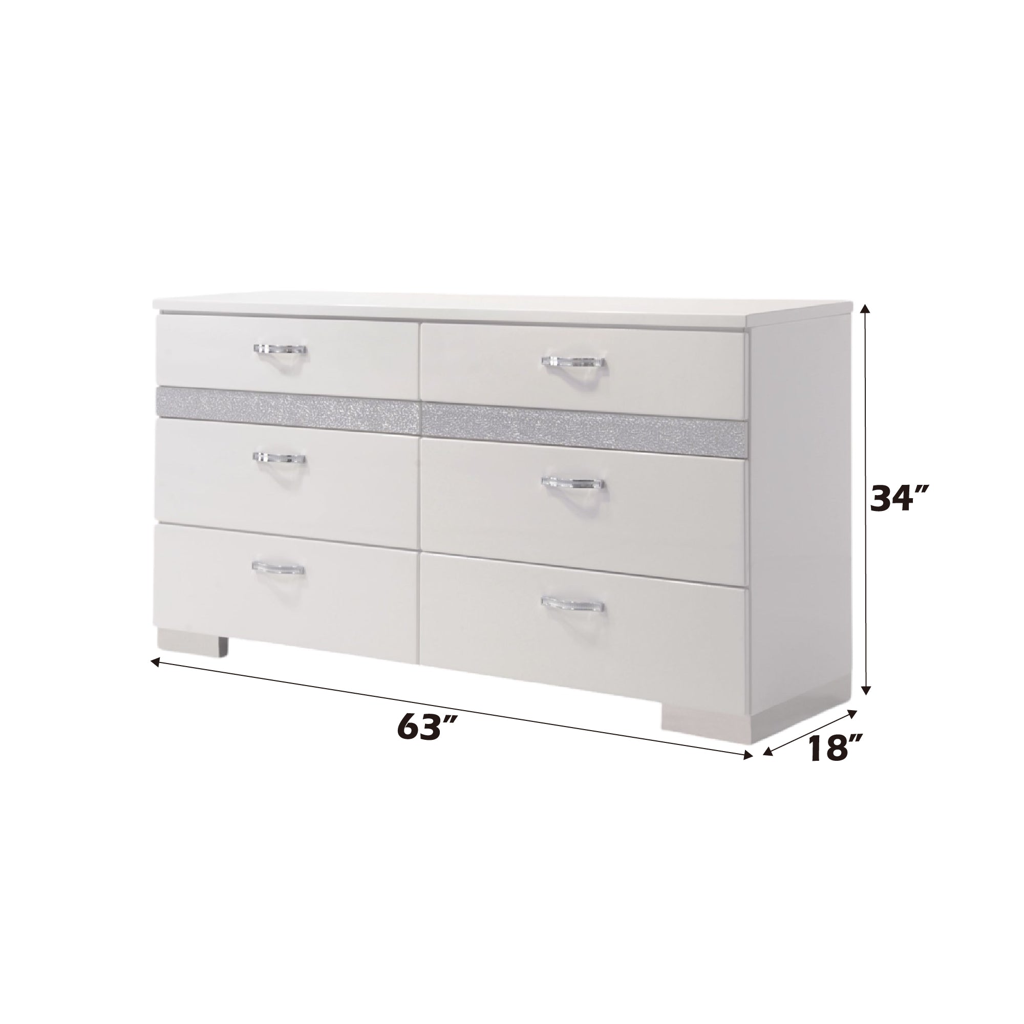 - Glittery accents on the drawer fronts add a touch of glamour, while sleek metal handles offer both style and ease of use, making this dresser a functional yet chic addition to any room.