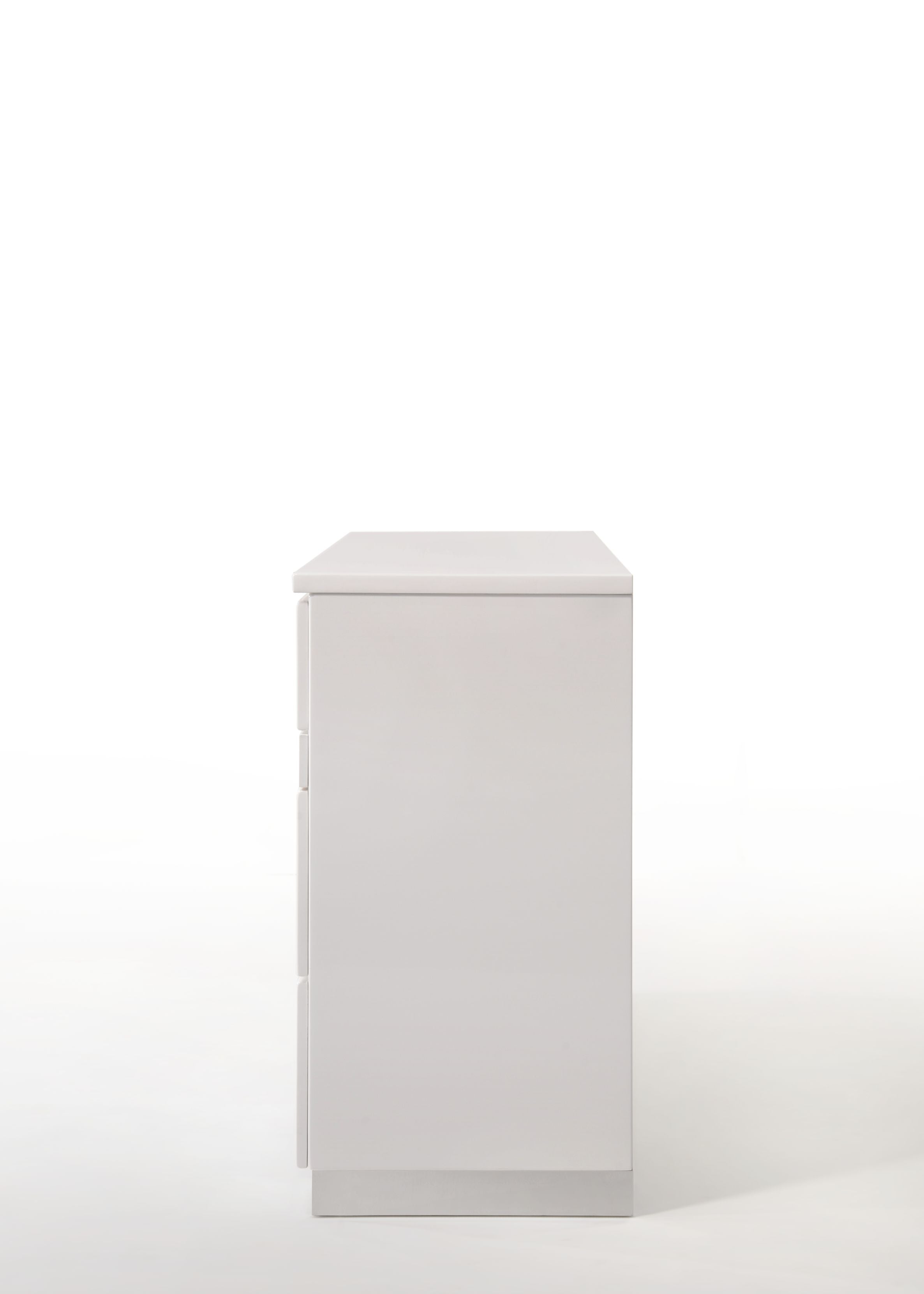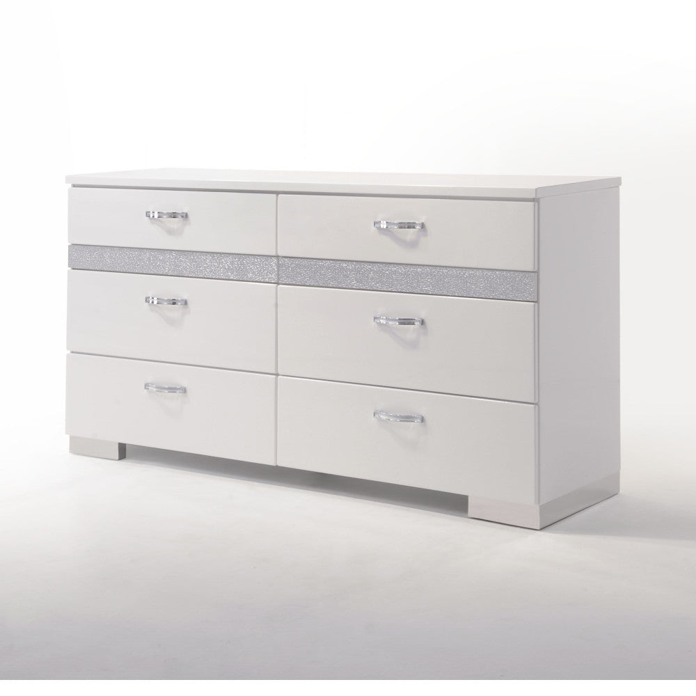 Bring order and a touch of glamour to your bedroom with the Naima II dresser — a modern, well-crafted storage piece designed for everyday use. Its clean lines and subtle glitter accents provide contemporary elegance, while thoughtful interior features keep clothing and valuables organized and protected.
