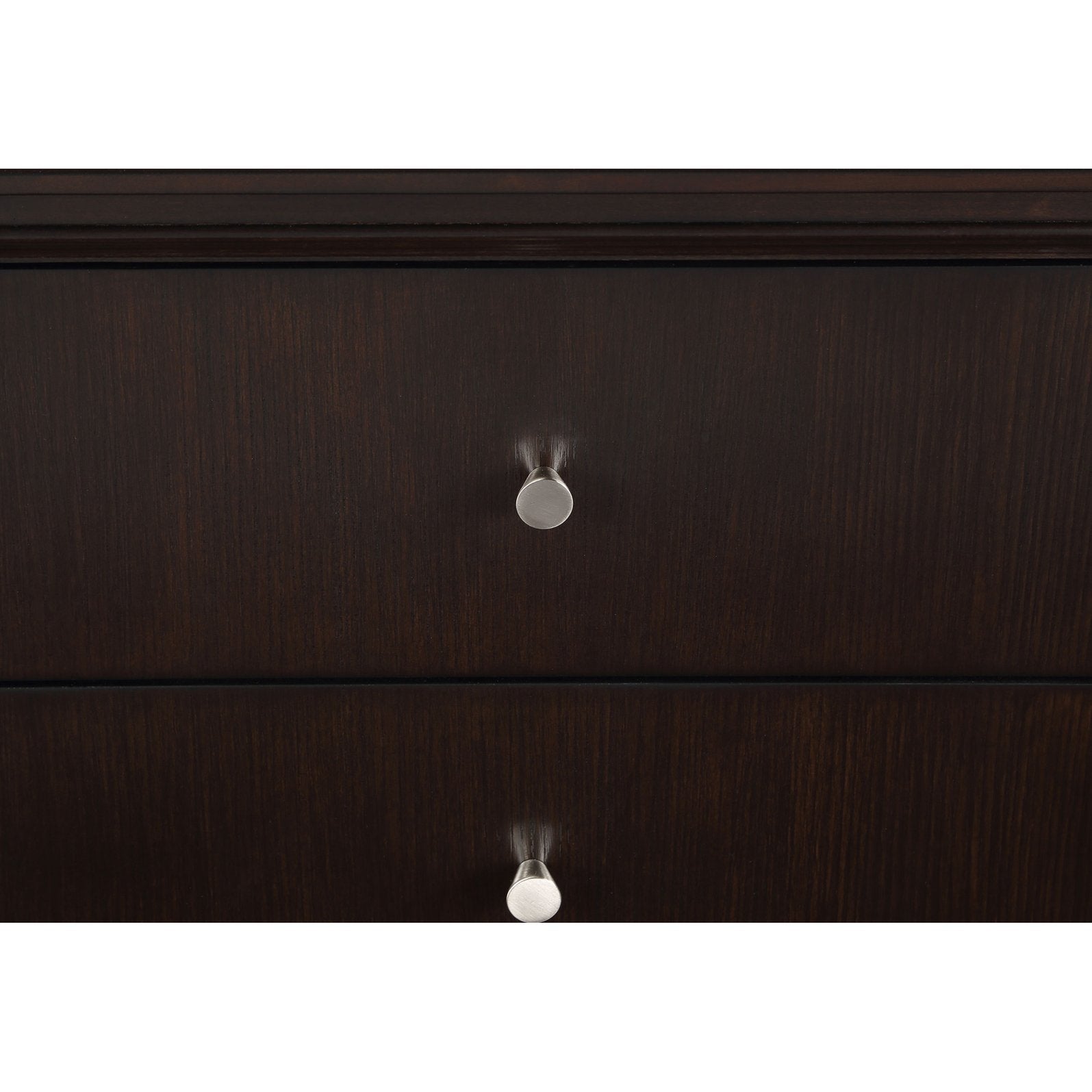 Add refined storage and modern warmth to your bedroom with this Niguel five-drawer chest. Its rich brown finish and tapered legs create a contemporary silhouette, while petite silver-toned knobs and ferrules provide subtle metallic contrast. Designed for both function and style, the chest organizes clothing and linens without overpowering your room’s decor.