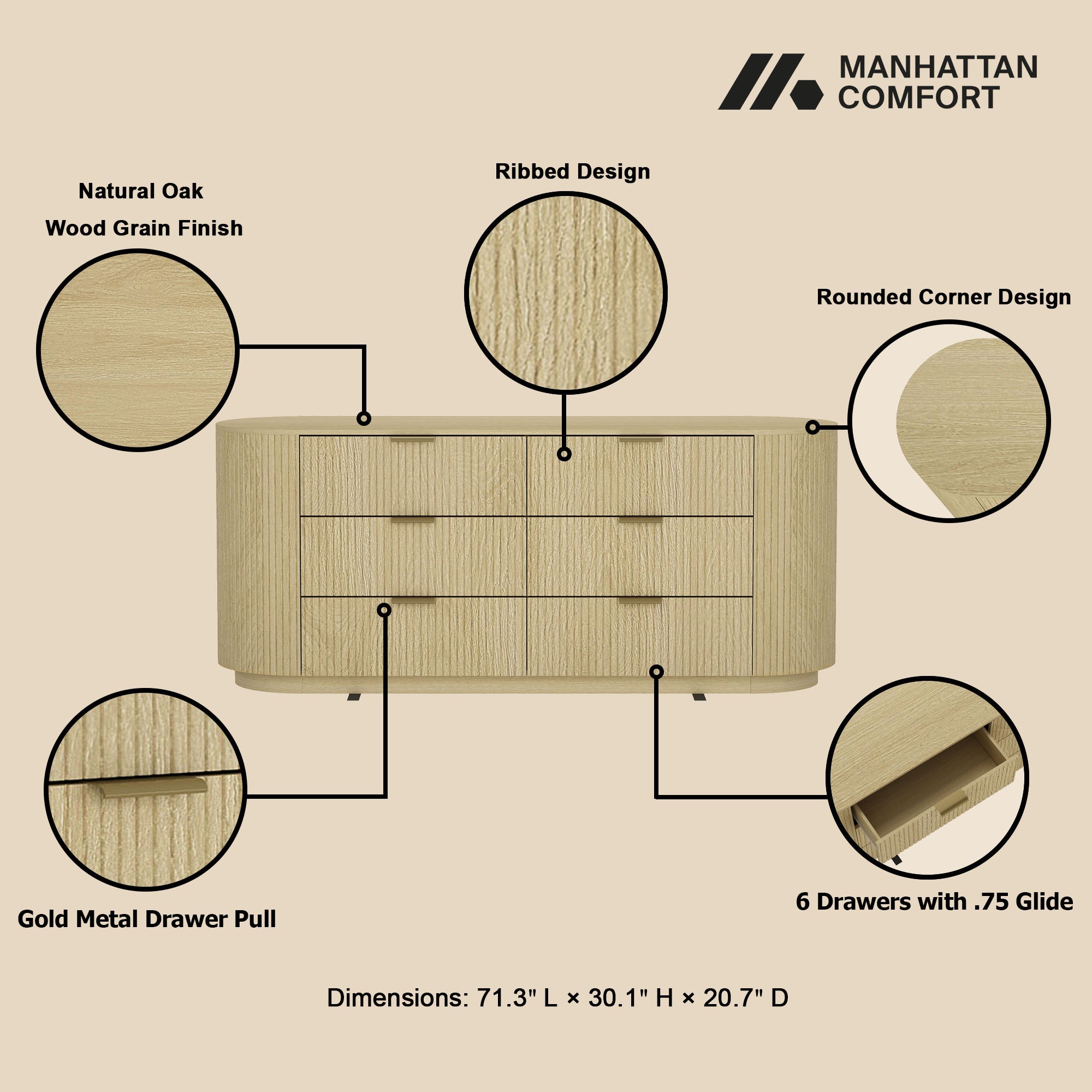 Elevate your bedroom with this elegant, modern dresser that blends clean lines and textured natural oak for a timeless look. Designed for both style and function, it offers ample storage across six smooth-gliding drawers and a durable finish that suits contemporary and classic interiors alike. Easy to assemble with all hardware included, this dresser is ideal for organizing clothing, displaying decor, or anchoring a bedroom layout.