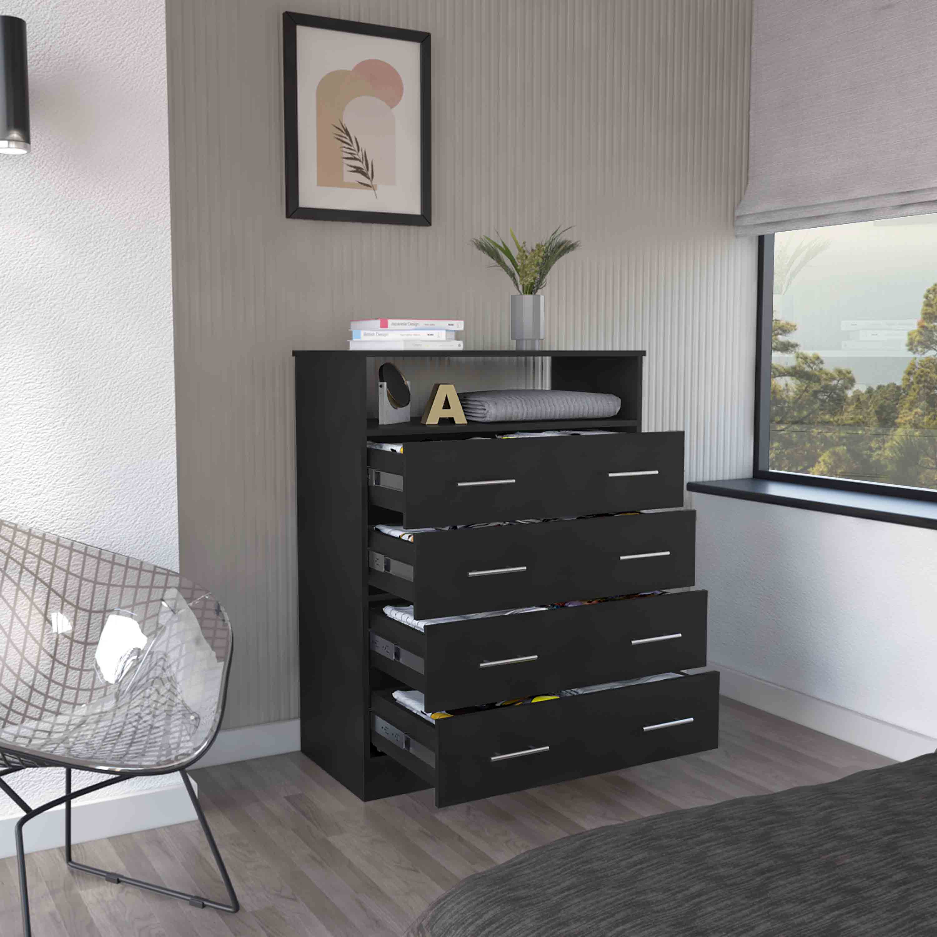 Elegant and functional, this black four-drawer dresser combines modern lines with practical storage to suit bedrooms, guest rooms, or multifunctional spaces. The superior top and open shelf offer display and easy-access areas, while roomy drawers keep clothing and essentials neatly organized. Durable particle board construction and metal hardware ensure everyday reliability.