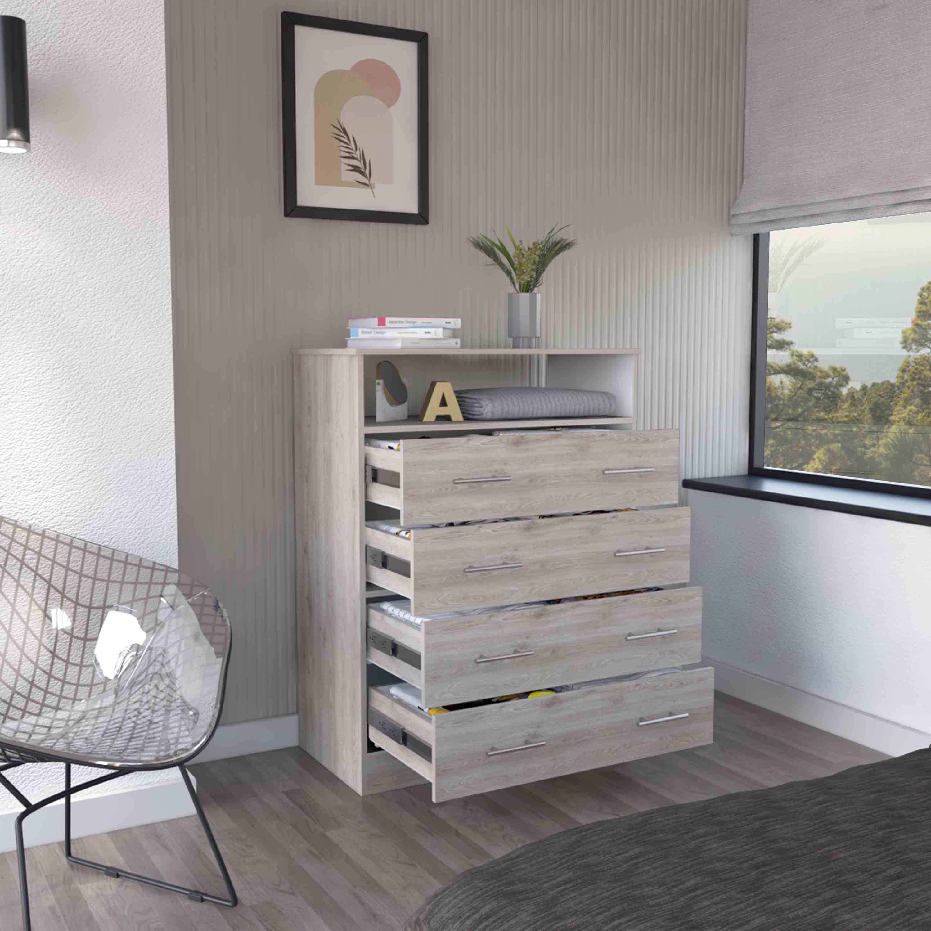 A sleek, contemporary four-drawer dresser that blends light gray and white finishes to bring clean lines and practical storage to bedrooms, entryways, or guest rooms. Designed with a superior top and open shelf for display or easy-access items, this piece balances style and function with durable materials and metal hardware for smooth operation.