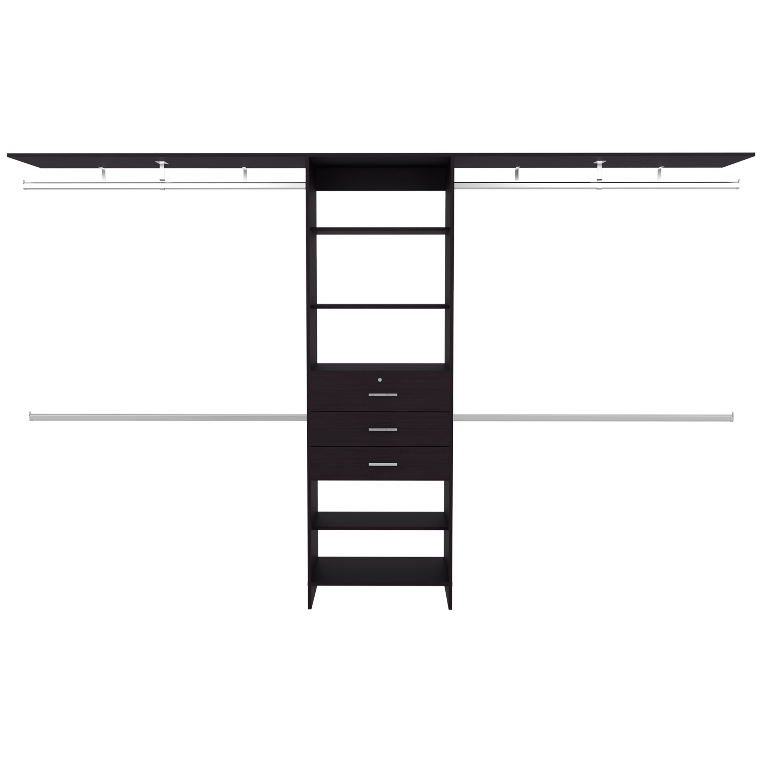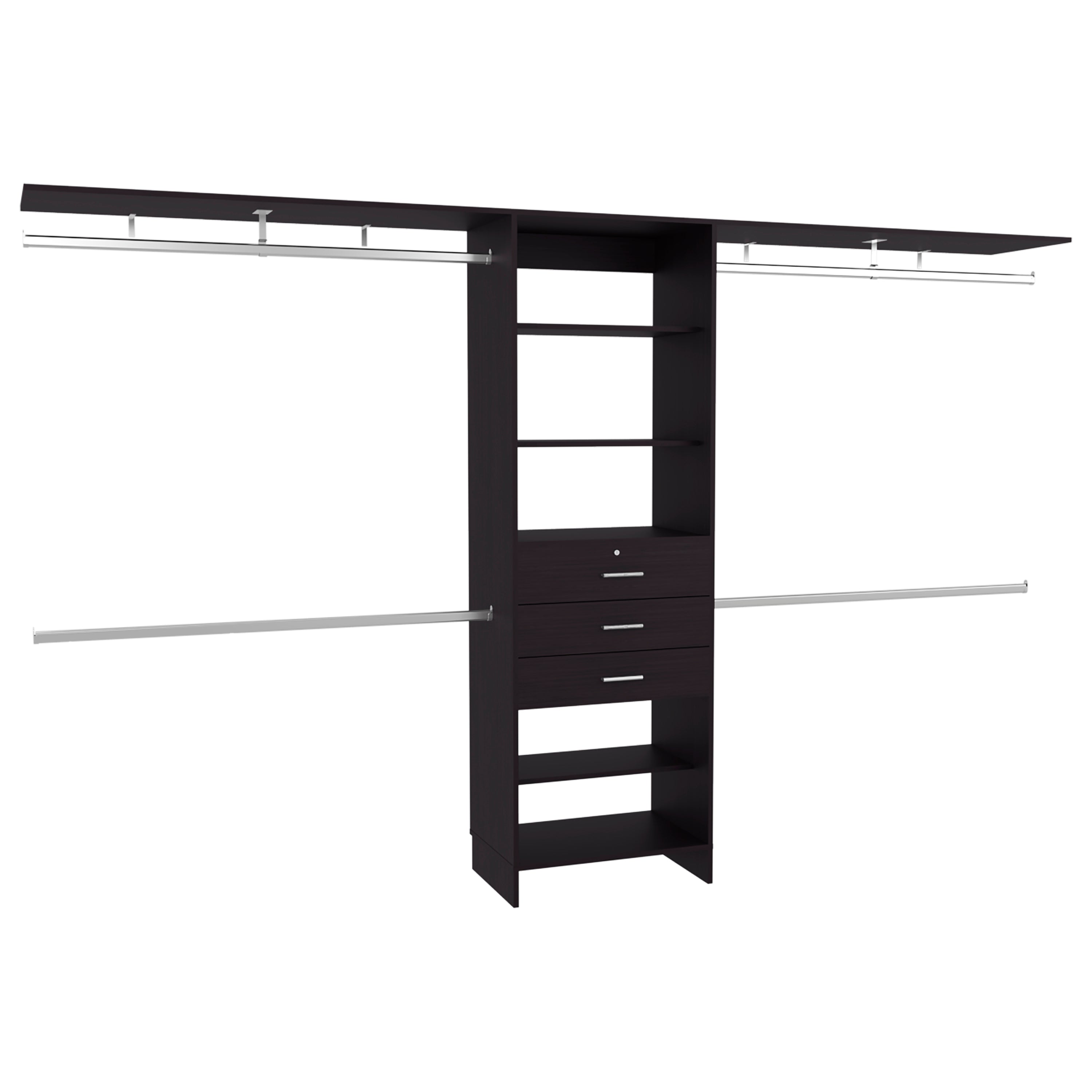 Organize your wardrobe with the Plego modular closet system — a sleek, Black Wengue MDF unit designed to maximize storage and adapt to changing needs. Whether you need a full 118" span or a compact 69" setup, this versatile system combines ample hanging space, open shelving, and smooth-operating drawers for a clean, tailored closet solution.