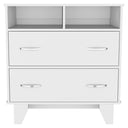 Elevate your bedroom or living space with the Portanova two-drawer dresser — a sleek, modern storage solution in black that combines open display shelving with concealed drawer space. Its compact footprint and raised four-leg design provide easy cleaning access and a contemporary silhouette suited to minimalist, Scandinavian, or urban interiors.