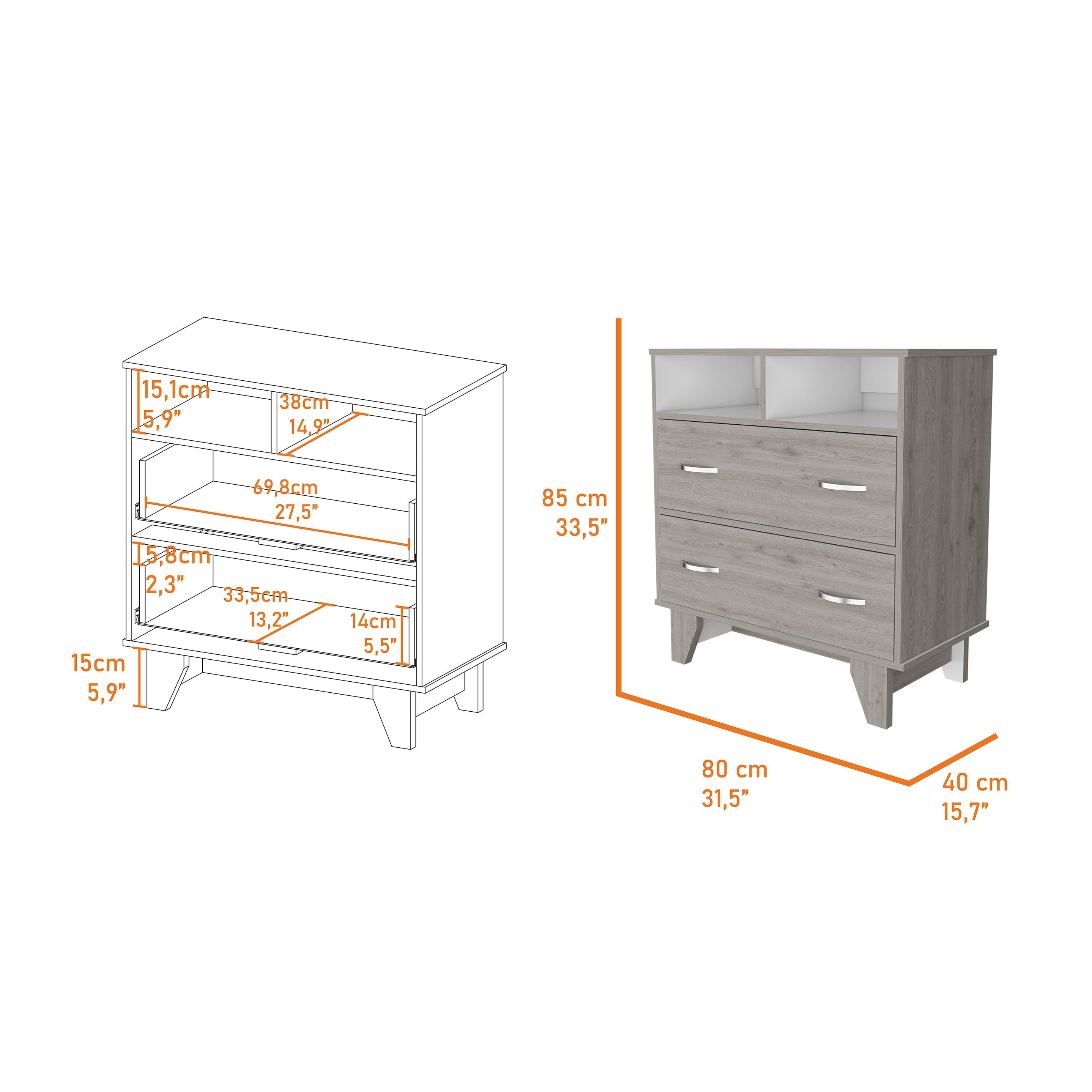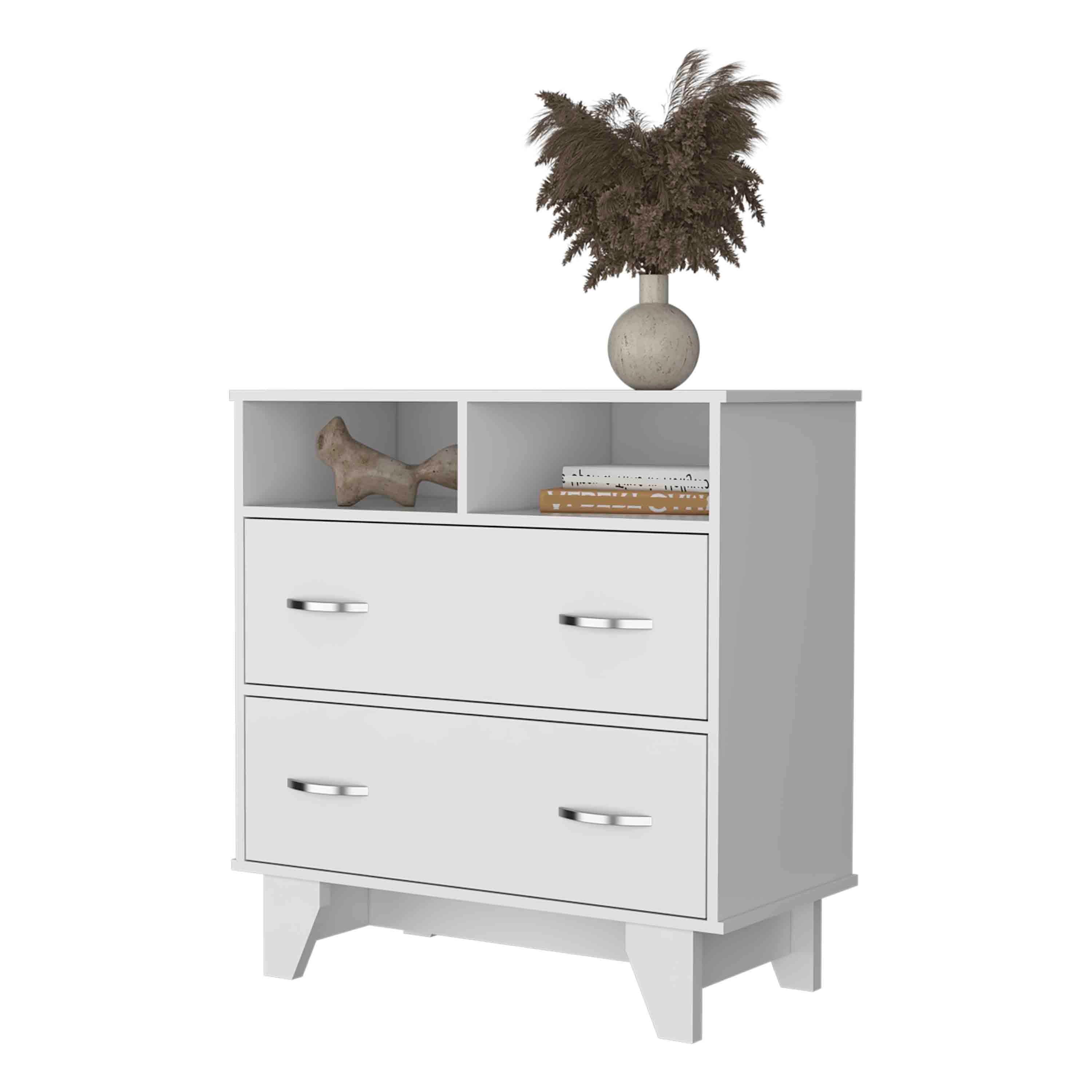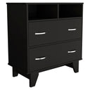 Bring modern function and clean lines to your bedroom or living area with this compact Portobelo two-drawer dresser. Designed for versatility, it pairs open shelving for display with enclosed storage for clothing or essentials. The black finish and raised four-leg profile give it a contemporary look while the superior top provides a sturdy surface for a lamp, decor, or daily use.