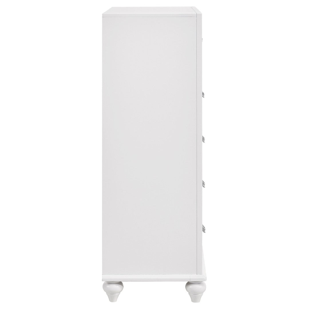 Elevate your bedroom or dressing area with a chic, space-saving chest that blends glam details with practical storage. This five-drawer piece pairs a clean white finish with glitter-acrylic accents and crystal hardware to create a soft, luminous look that complements both modern and transitional decor while keeping linens and clothing neatly organized.