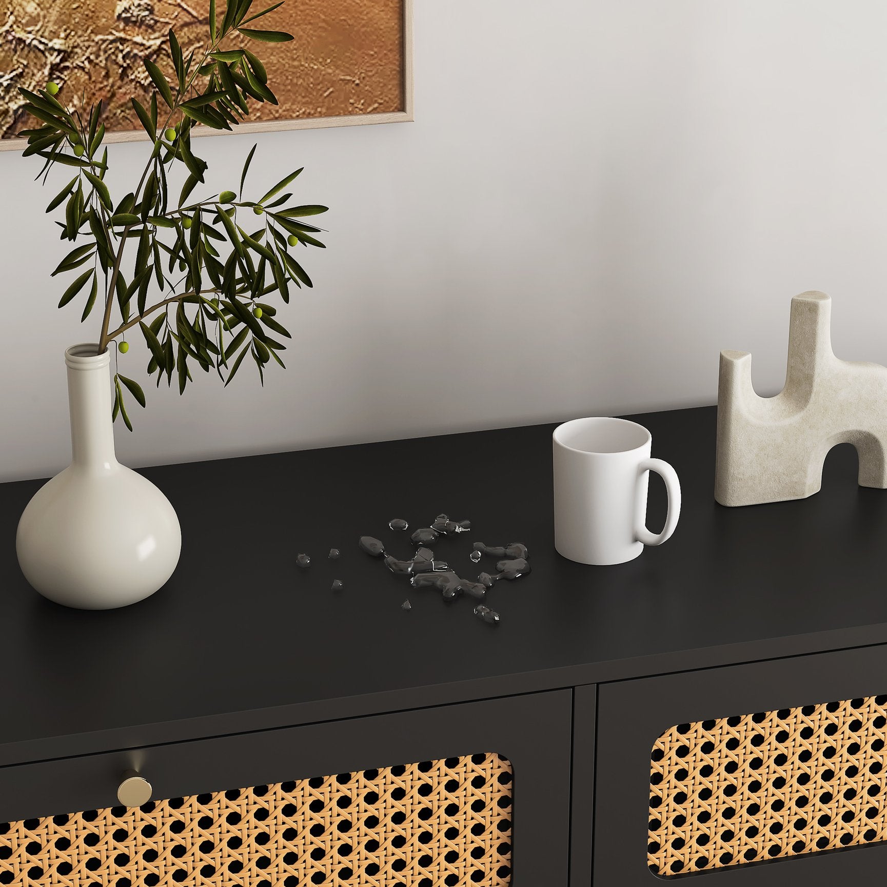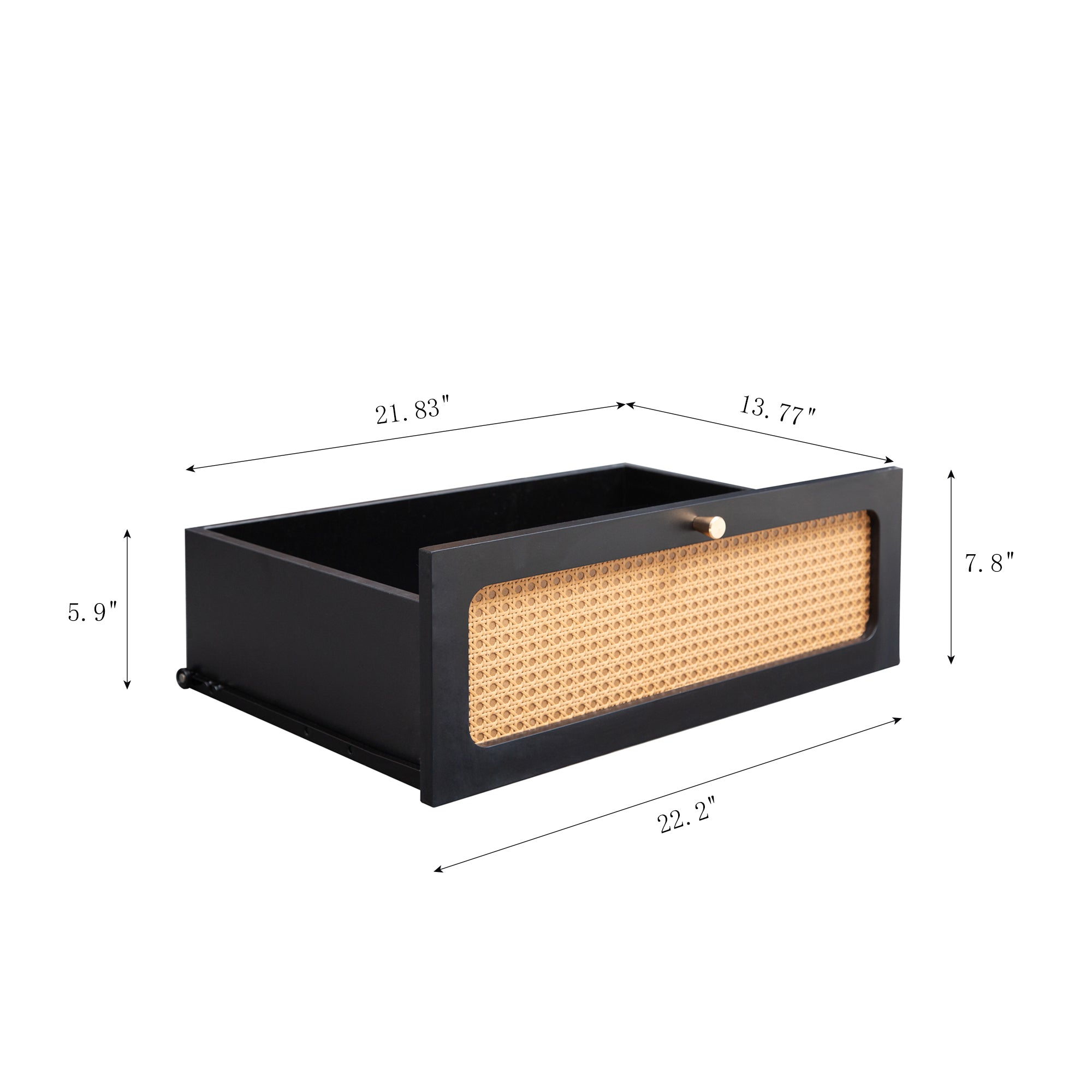 - Design: Contemporary silhouette with woven rattan drawer fronts and classic gold metal handles for an elevated look