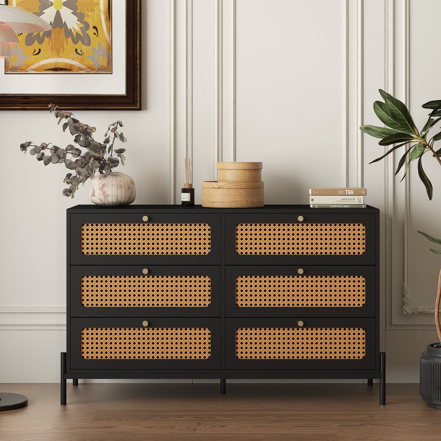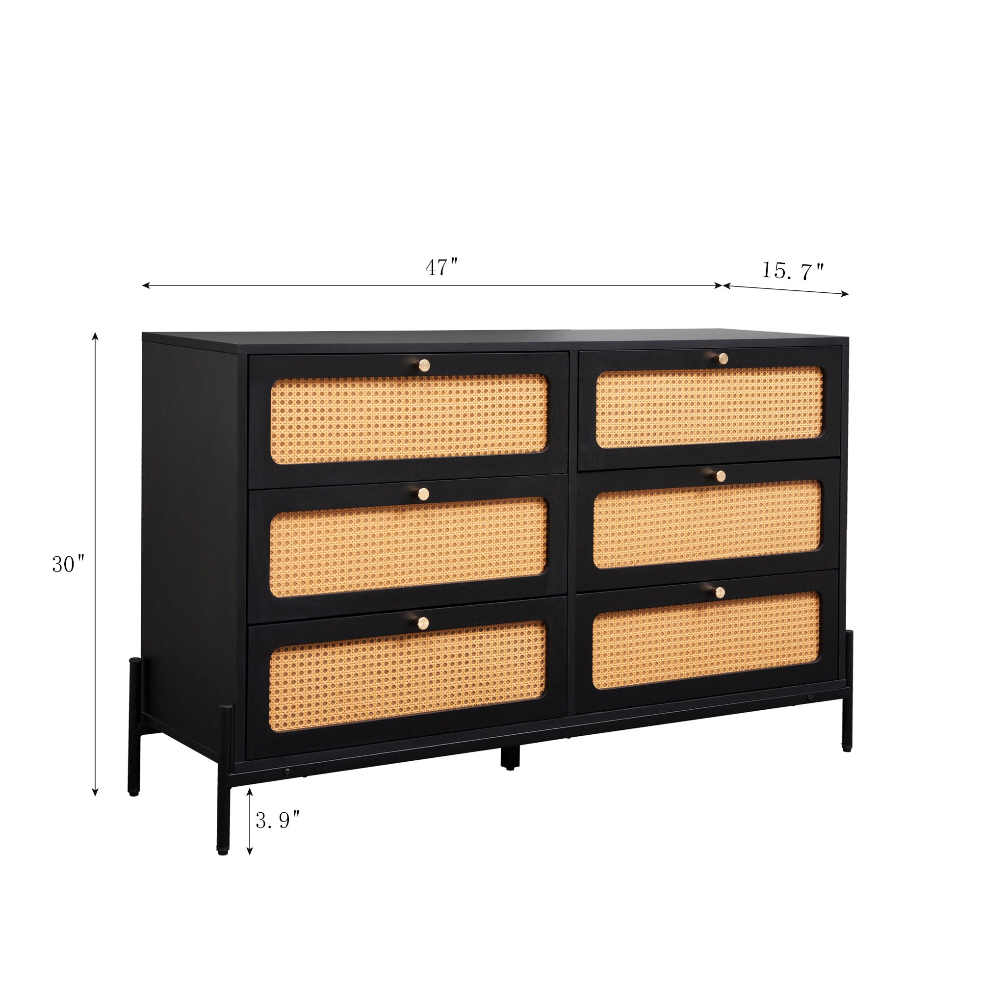 - The 6-drawer dresser with simple design. Various decoration styles are compatible with this modern minimalist 6 drawer chest. Adding rattan door and classic gold metal handle to the simple monochromatic wood panel adds advanced aesthetics to this product.