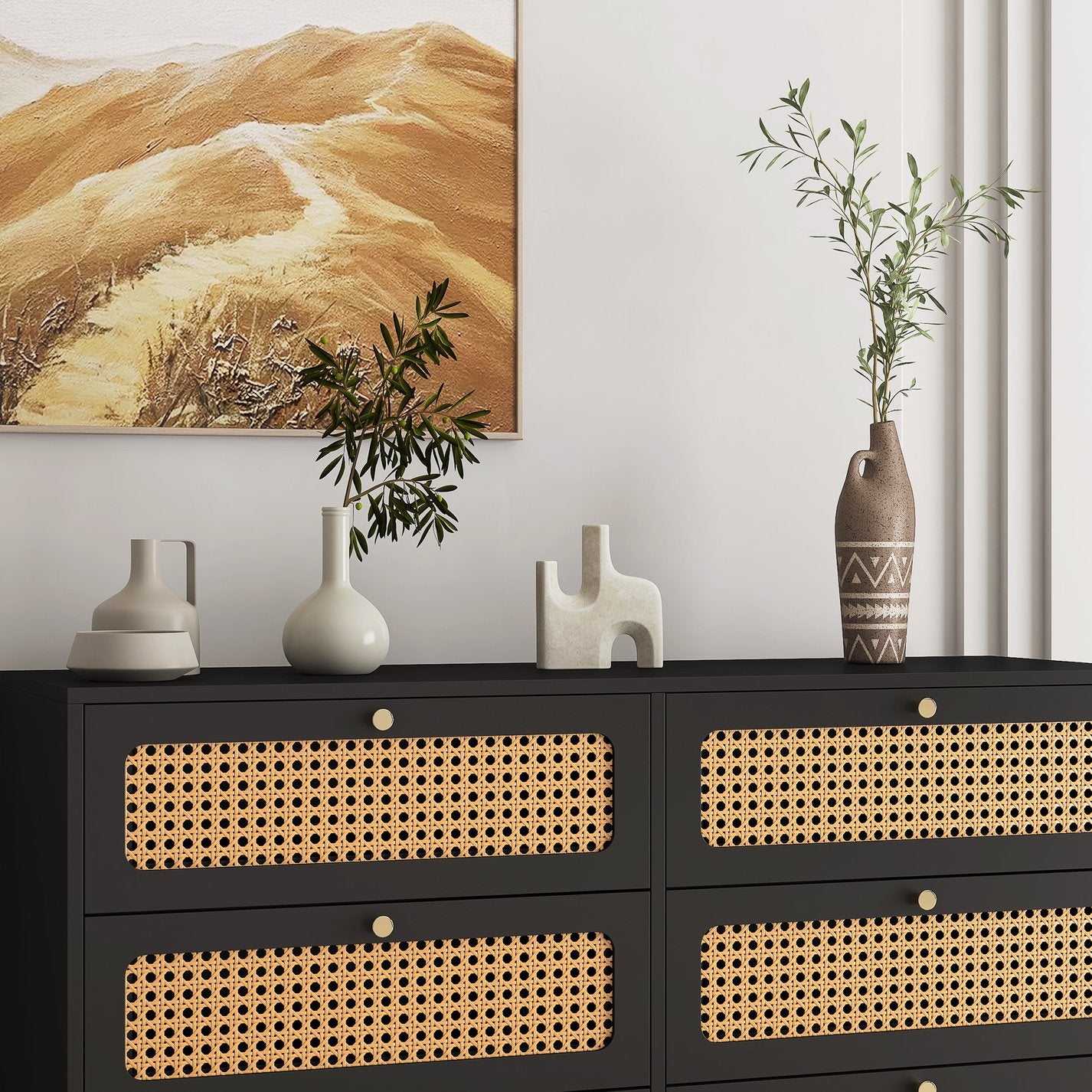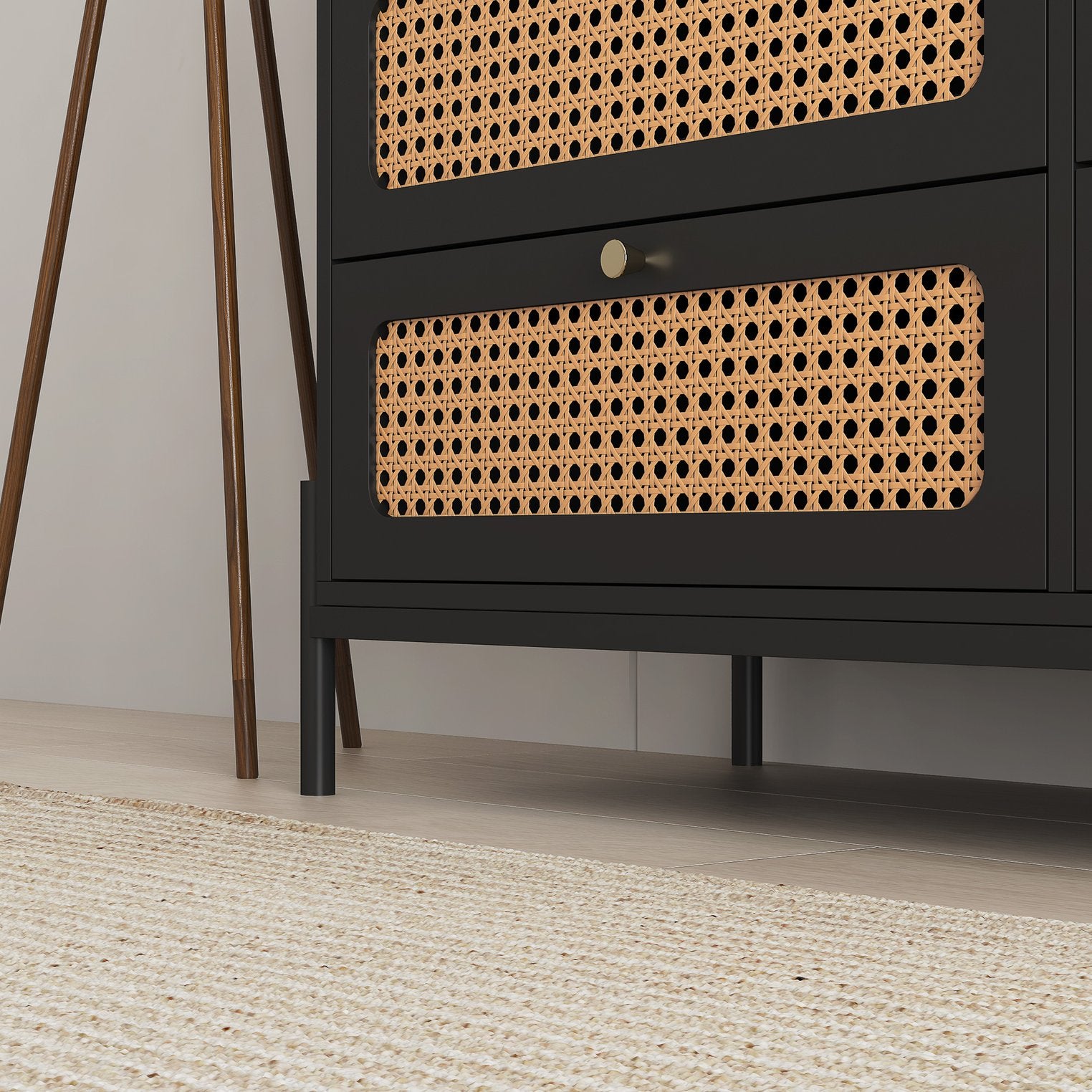 Add a touch of natural texture and modern elegance to your home with this rattan-front 6-drawer storage cabinet. Designed for everyday use, it pairs warm rattan panels and gold metal handles with a sturdy MDF frame to create a versatile dresser that works equally well in the bedroom, living room, office, or entryway. Its clean lines and practical layout make organizing clothes, linens, or household essentials simple and stylish.
