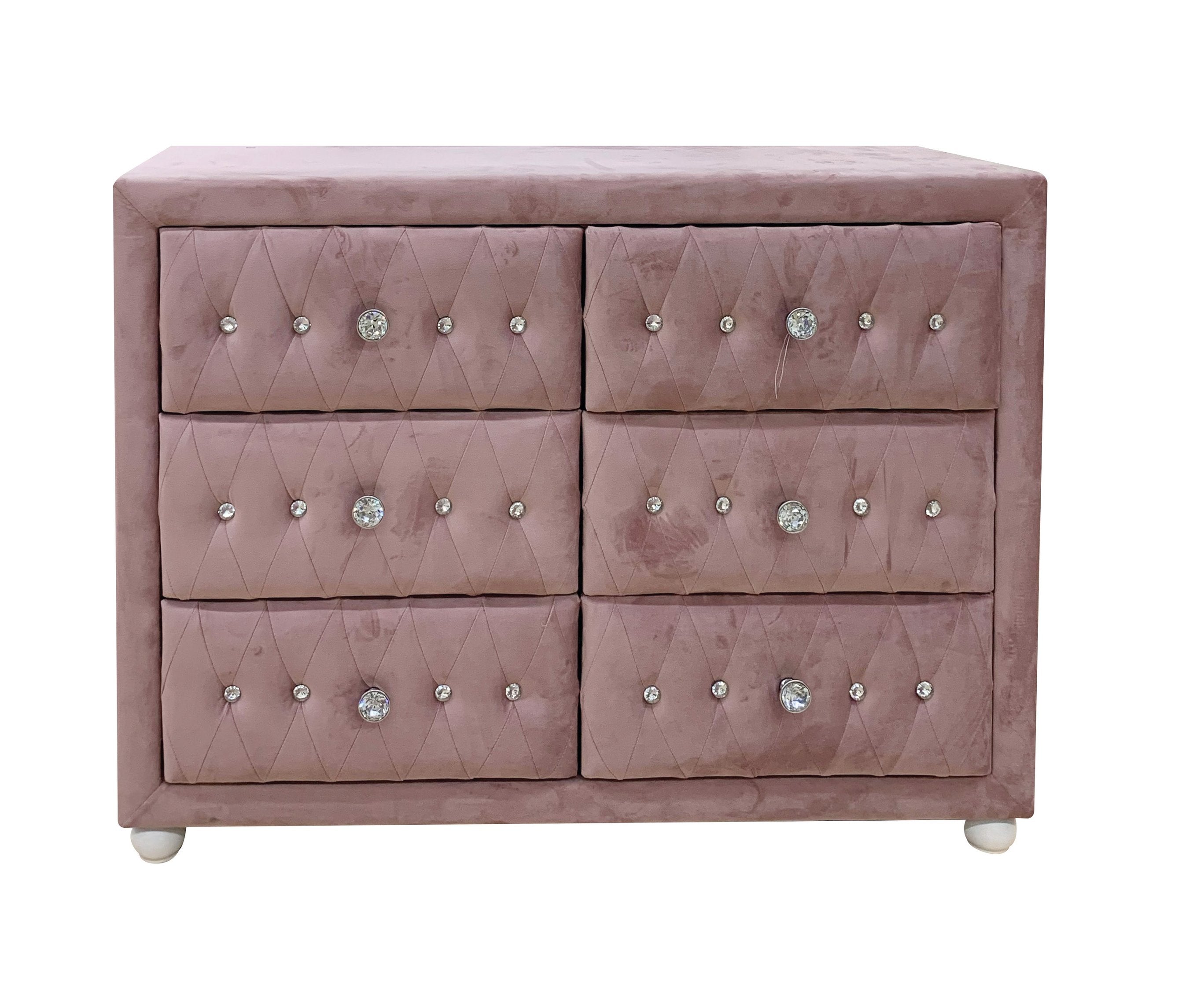Bring modern charm and soft texture to any bedroom with the Reggie Pink Fabric Dresser. Upholstered in a durable pink fabric over a sturdy composite wood frame, this dresser combines gentle aesthetics with reliable construction and thoughtful storage. Ideal for children's rooms, guest bedrooms, or anyone seeking a playful yet refined storage piece, it offers six roomy drawers with smooth metal glides and dovetail joinery for long-lasting use.