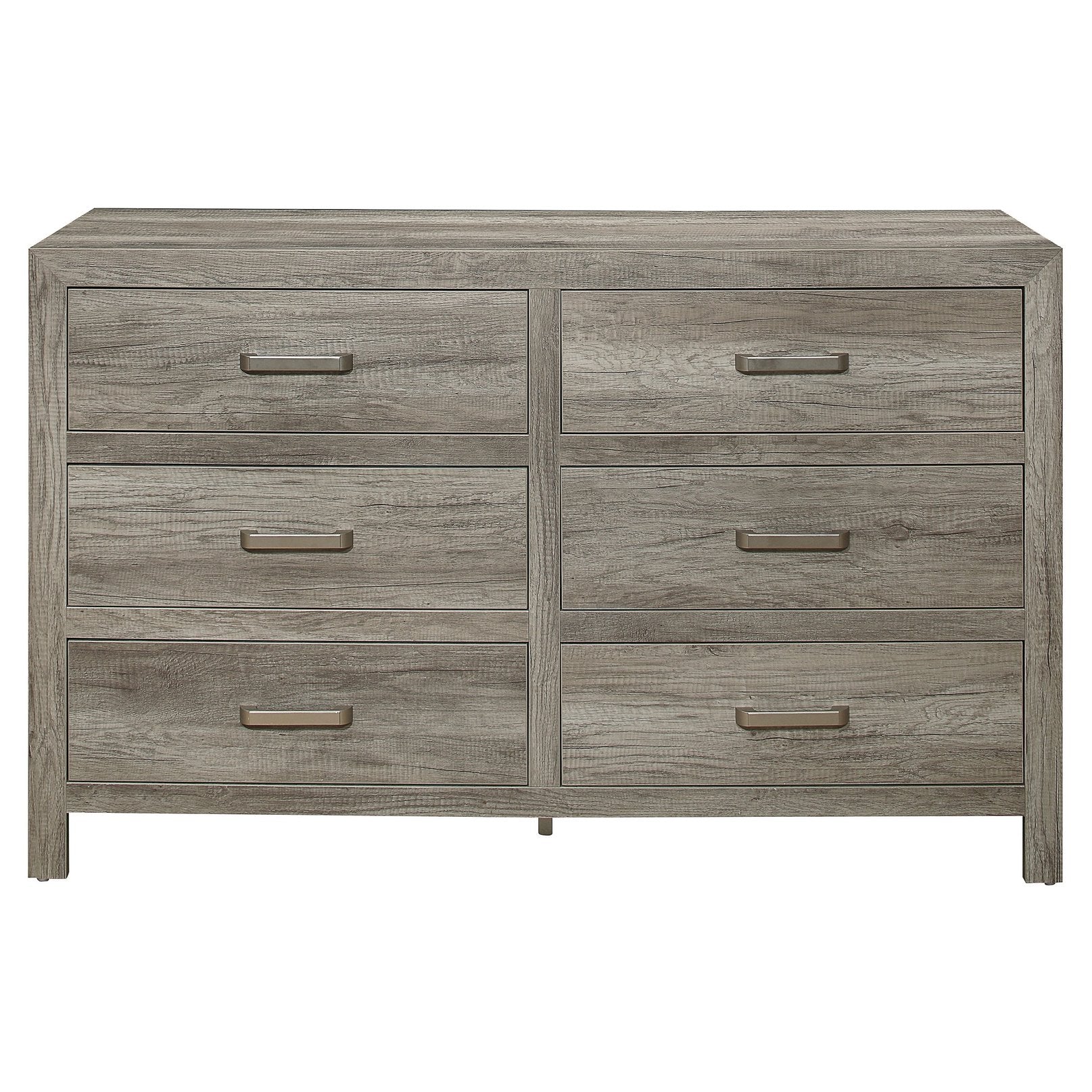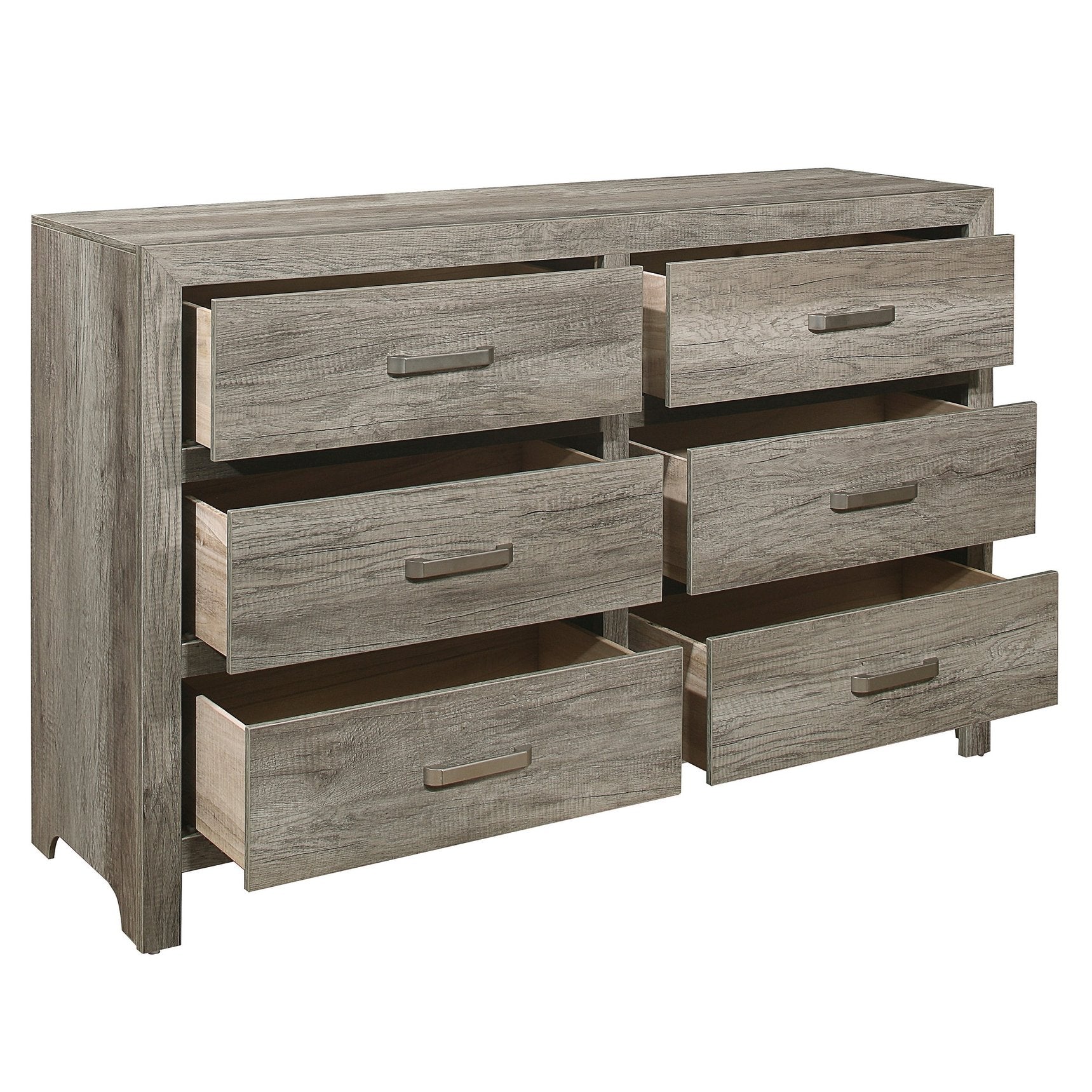 Update your bedroom with the Mandan dresser — a rusticated, weathered-gray piece that blends modern lines with transitional styling to give your space a relaxed yet refined look. Constructed with durable faux wood veneer that mimics authentic planks, this six-drawer dresser features satin nickel bar pulls for a subtle metallic contrast. It offers generous storage, smooth operation, and a versatile finish that pairs well with a variety of decor.