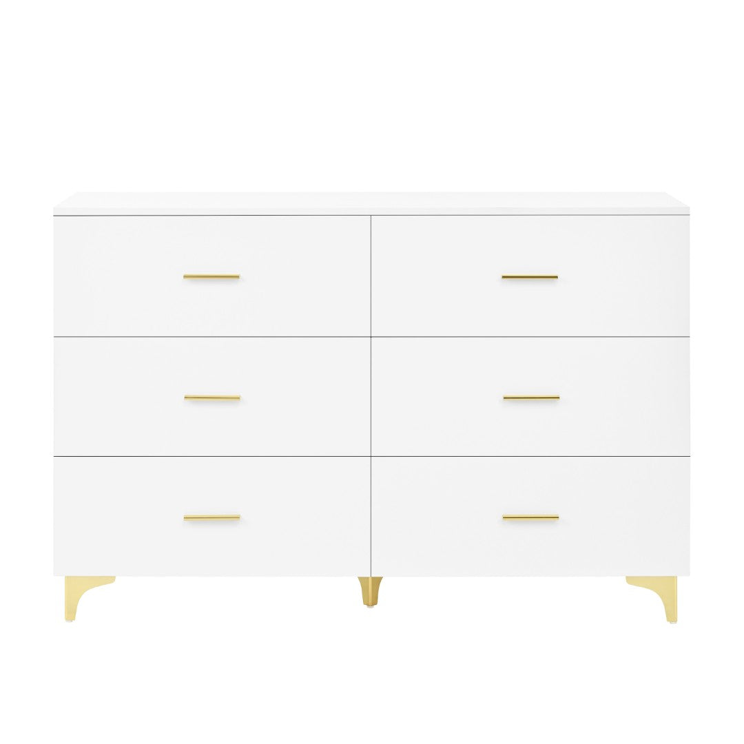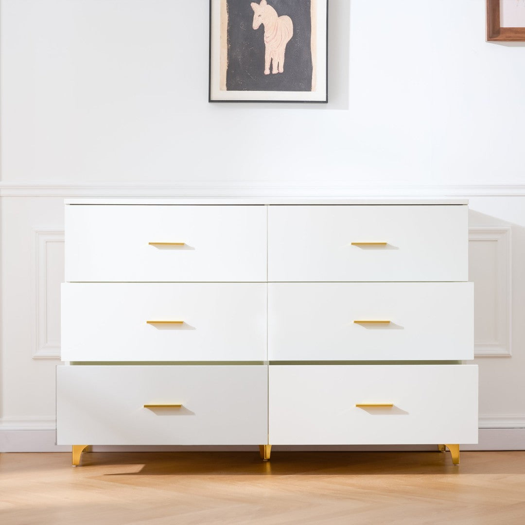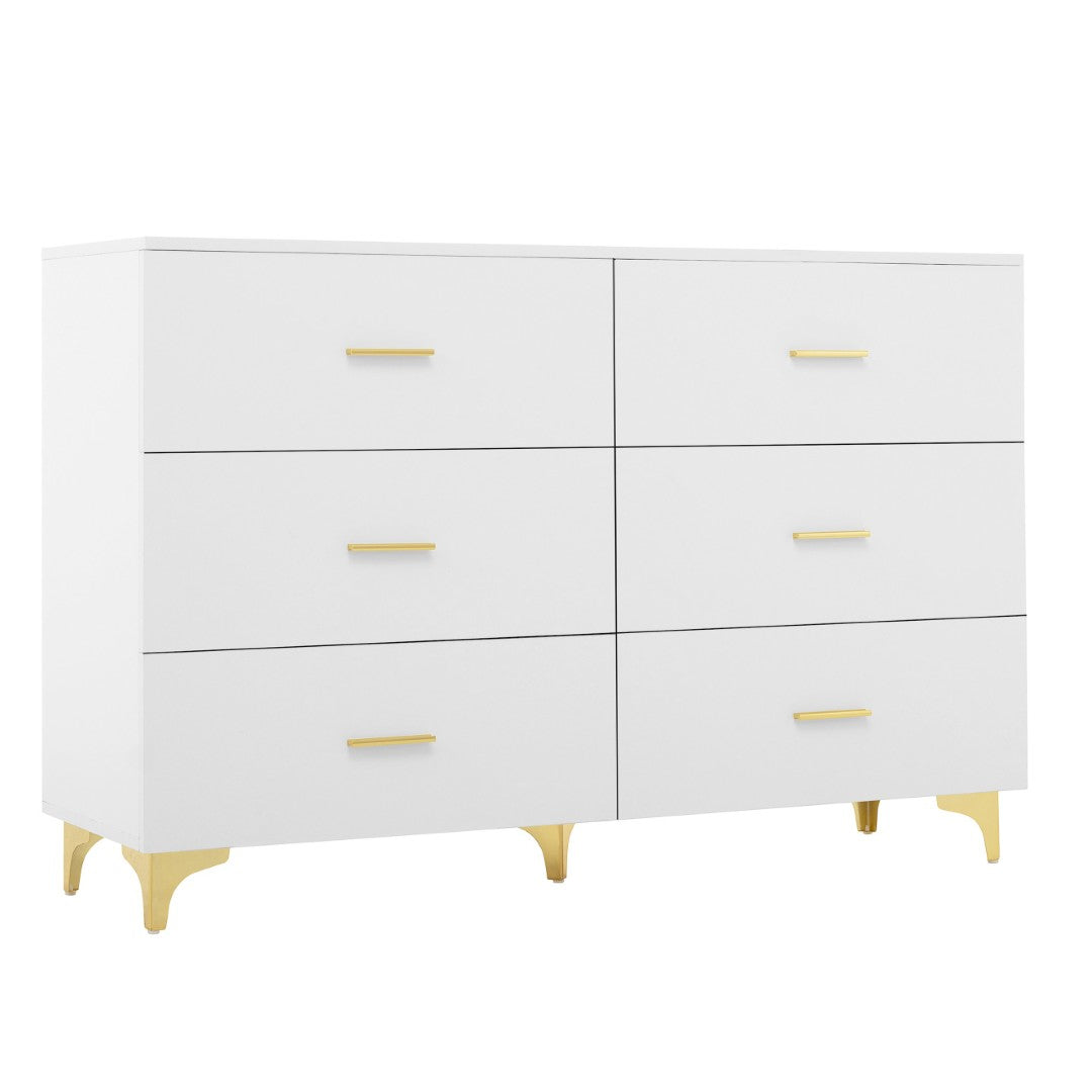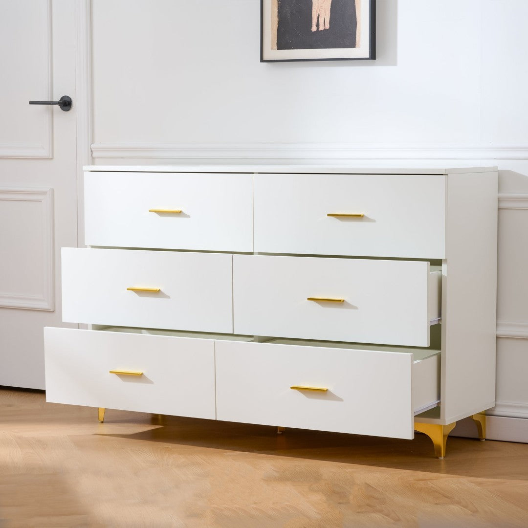 Refresh your space with this elegant six-drawer locker that blends minimalist modern design with practical storage. Finished in crisp white with polished gold accents, its clean lines and slim triangular legs create a light, refined silhouette that complements contemporary, Scandinavian, or eclectic interiors. Built from durable particle board and MDF, this chest is designed to balance style and everyday function—offering smooth-operating drawers and a stable surface for decorative items or essentials.