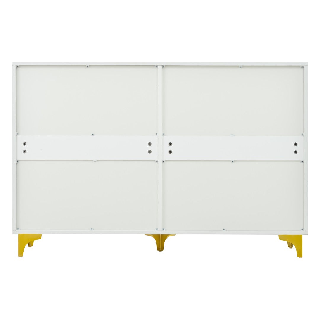 - This chest of drawers exhibits a plethora of appealing features from multiple perspectives.Aesthetically, it embraces a minimalist and modern design style. The clean, straight lines and smooth surfaces contribute to a sleek and uncluttered look. The all-white finish lends an air of brightness, purity, and elegance, making it a versatile piece that can seamlessly integrate into various interior design schemes, be it a contemporary, Scandinavian, or even a more eclectic space. The gold accents,