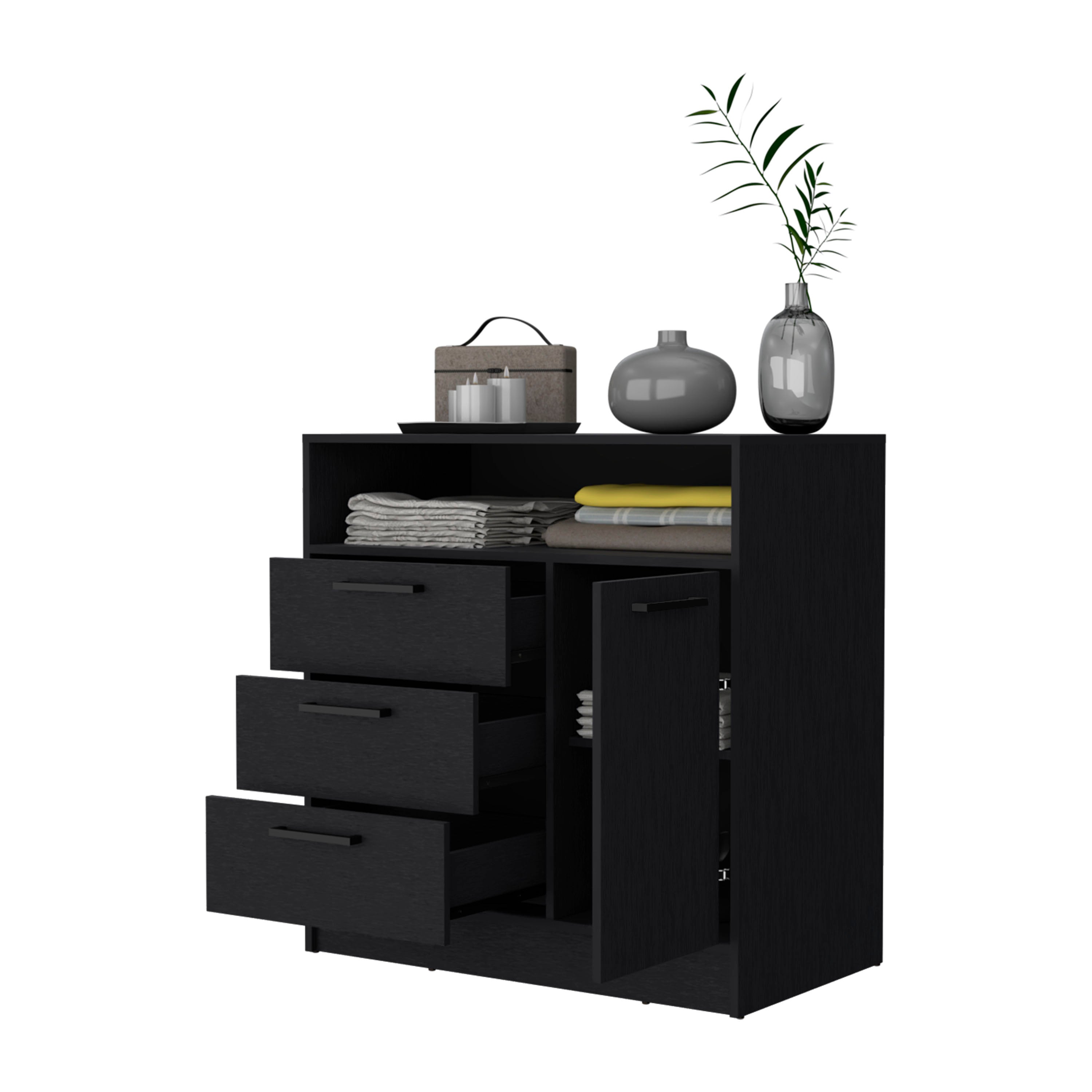 - Storage configuration: Three full-width drawers plus one single-door cabinet with interior shelf for folded items, shoes, or supplies