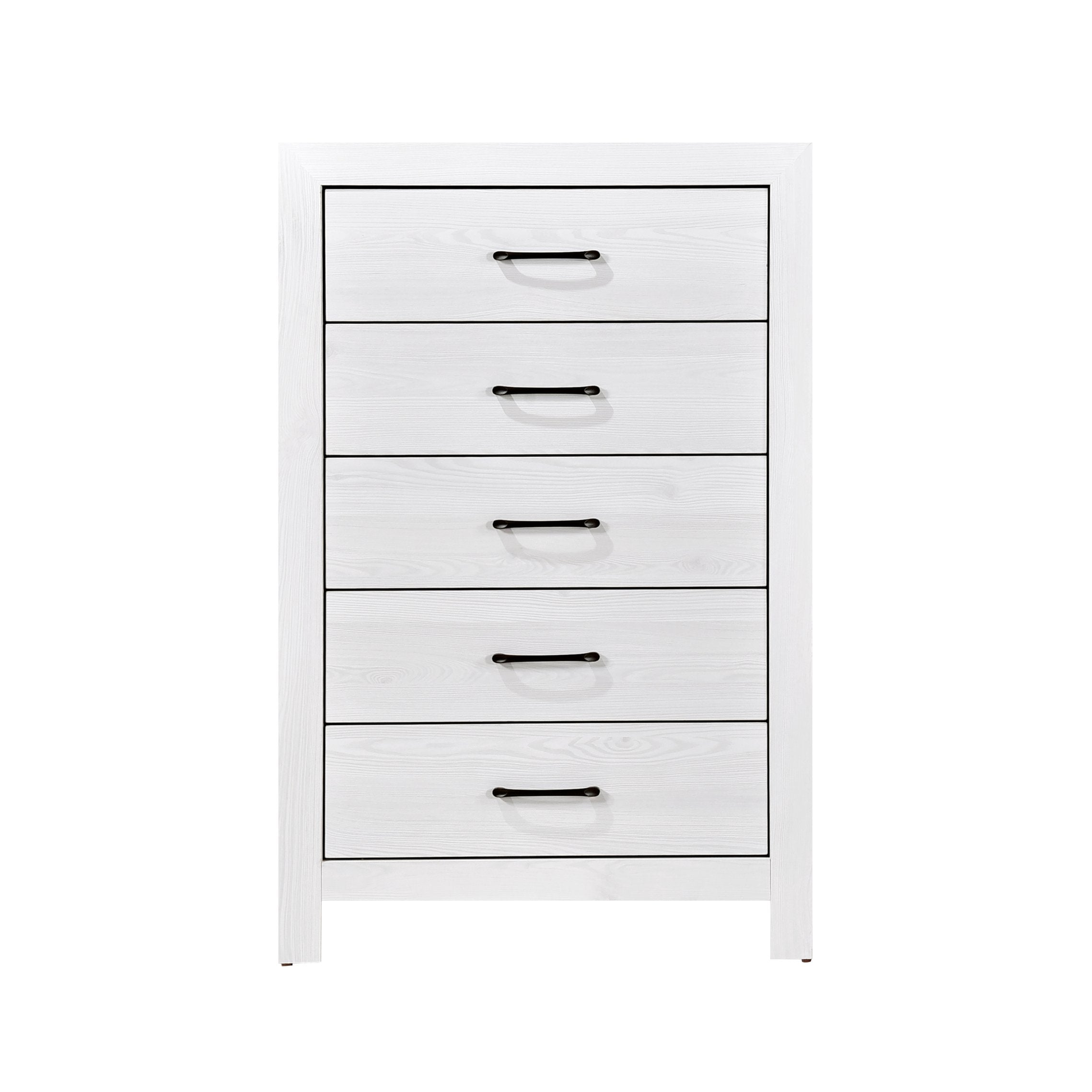 Bring modern minimalism and rustic texture into your bedroom with this five-drawer storage chest. Clean lines, a white 3D printed paper veneer that mimics real wood grain, and contrasting black metal hardware create a versatile piece that complements a range of decor styles while delivering practical organization for clothing and linens.