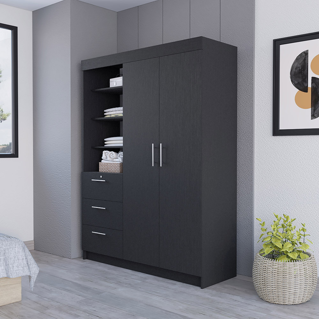 - Modern black dresser with metal accents.