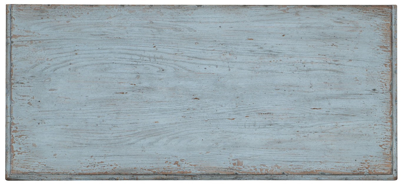 - Finish: Skylark Blue with natural wood undertones; distressed details include rasping, gouging, and wormholes for an authentic aged look