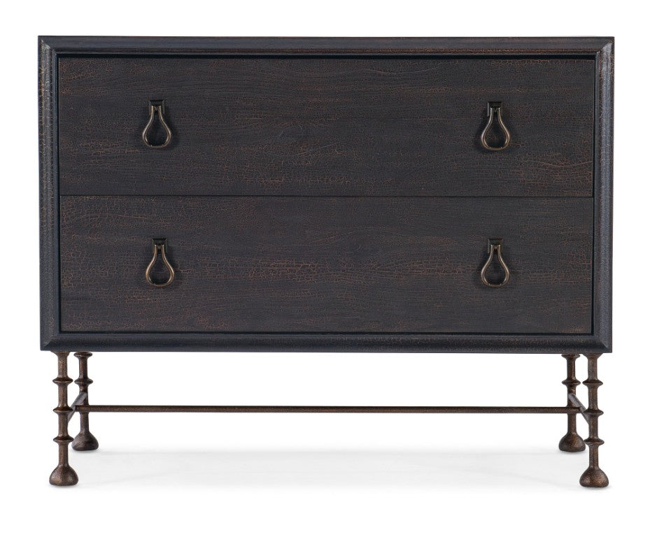 Bring rustic charm and practical organization to your bedroom with the Big Sky Bachelor’s Chest. Crafted from pecky hickory veneers with a warm, weathered finish and complemented by turned metal legs, this compact chest blends vintage styling with modern conveniences such as a felt-lined top drawer, cedar-lined bottom drawer, and built-in power options for charging devices.