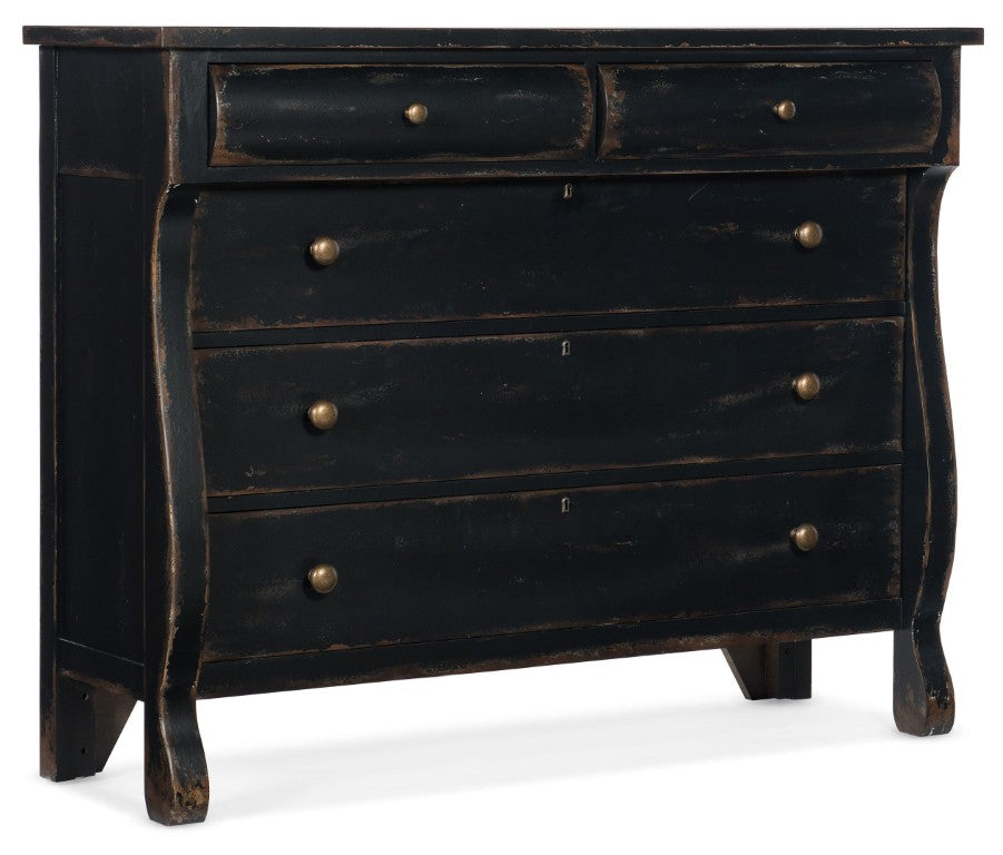 Evoking the charm of a bygone era, this five-drawer bureau blends vintage romance with practical storage. Its softly curved front, chunky feet and multi-layered black finish give the piece an heirloom quality, while thoughtful interior features protect and organize your garments and keepsakes.