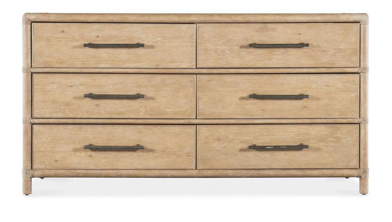 Evoking the relaxed elegance of a seaside retreat, this rattan-accented dresser combines natural oak and maple veneers with thoughtful storage features for everyday living. Its sand-colored "Dune" finish subtly highlights the wood grain, while rope accents and soft pewter bar pulls add coastal texture and refined detail. Built for organization and longevity, the piece balances decorative character with practical functionality.