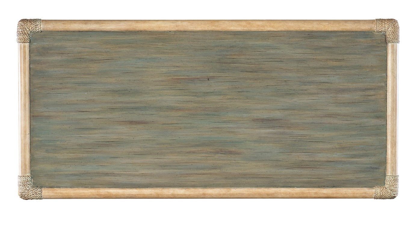 Retreat is crafted with flat cut cathedral oak veneers and is characterized by two distinct finishes. Each finish is transparent by design to showcase the unique grain patterns of the veneer. Dune is light as sand and smooth as a shore after a receding tide. The second finish, Black Sand was inspired by the black silk sands found on the shorelines of exotic beaches of Maui and Tahiti. Inspired by serene, tropical resort destinations that offer an escape from the pressures of modern life, Retreat is designed to help consumers replicate these peaceful and tranquil environments within their home. The collection can be curated in two distinct personalities: Island Oasis and Modern Zen. Island Oasis intermingles both finishes, creating a tropical retreat-inspired vibe accentuated with organic details such as rope, cane, travertine and woven accents. Highlights include a dramatic pole-cane inspired poster bed, island influenced dining pieces and several upholstered accent pieces using printed and woven textiles and soft sage-toned leather. A few pops of accent finishes called Seagrass and Lagoon can be found on select pieces, enhancing the tropical mood of the collection. Modern Zen delivers a tranquil personality with a contemporary twist that showcases the Dune finish, which is enhanced with accent items in Black Sand. Several pieces incorporate woven cane, dramatic split bamboo-inspired accents as well as Travertine stone. Highlights include a woven cane panel bed with clean modern lines and a variety of case pieces featuring geometric patterns and spa-inspired accents. Upholstered stationary and accent seating – available in sage and caramel tone leathers – complete the Zen narrative. Adding the finishing touch, the collection’s hardware is custom designed to match each personality. Look for reed-inspired designs in Island Oasis and gently textured designs in Modern Zen. Both hardware options are featured in a soft pewter plated finish.