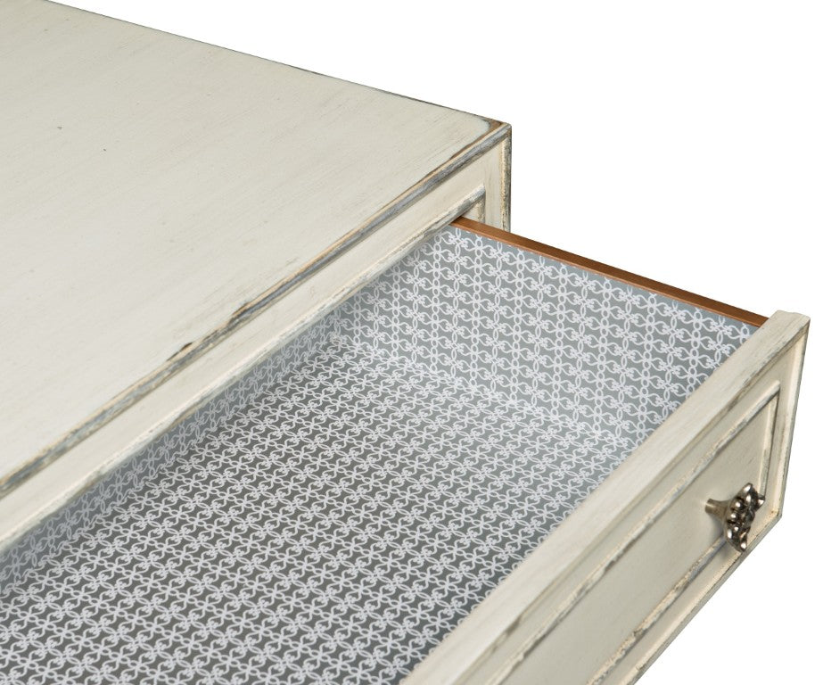 Elevate your bedroom with the Sanctuary Anastasie Dresser — a refined, Hollywood‑glamour inspired piece that blends elegant detailing with thoughtful functionality. Its creamy Blanc finish, subtle champagne and silver tipping, and jewelry‑like hardware make this dresser a striking focal point, while lined and cedar drawers, felt‑lined jewelry storage, and drop‑front compartments keep your belongings organized and protected.