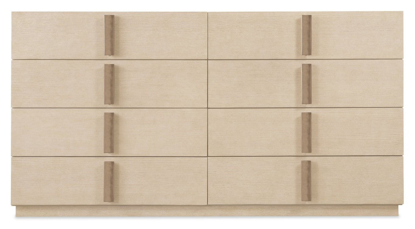 Refined craftsmanship meets everyday practicality in this spacious eight-drawer dresser. Thoughtfully designed for modern bedrooms, it pairs quartered oak veneer and a Polished Limestone finish with subtle metallic accents, offering generous organized storage while preserving garments with cedar-lined lower drawers. The plinth base and plated Radiance hardware complete a clean, contemporary silhouette that elevates any room.