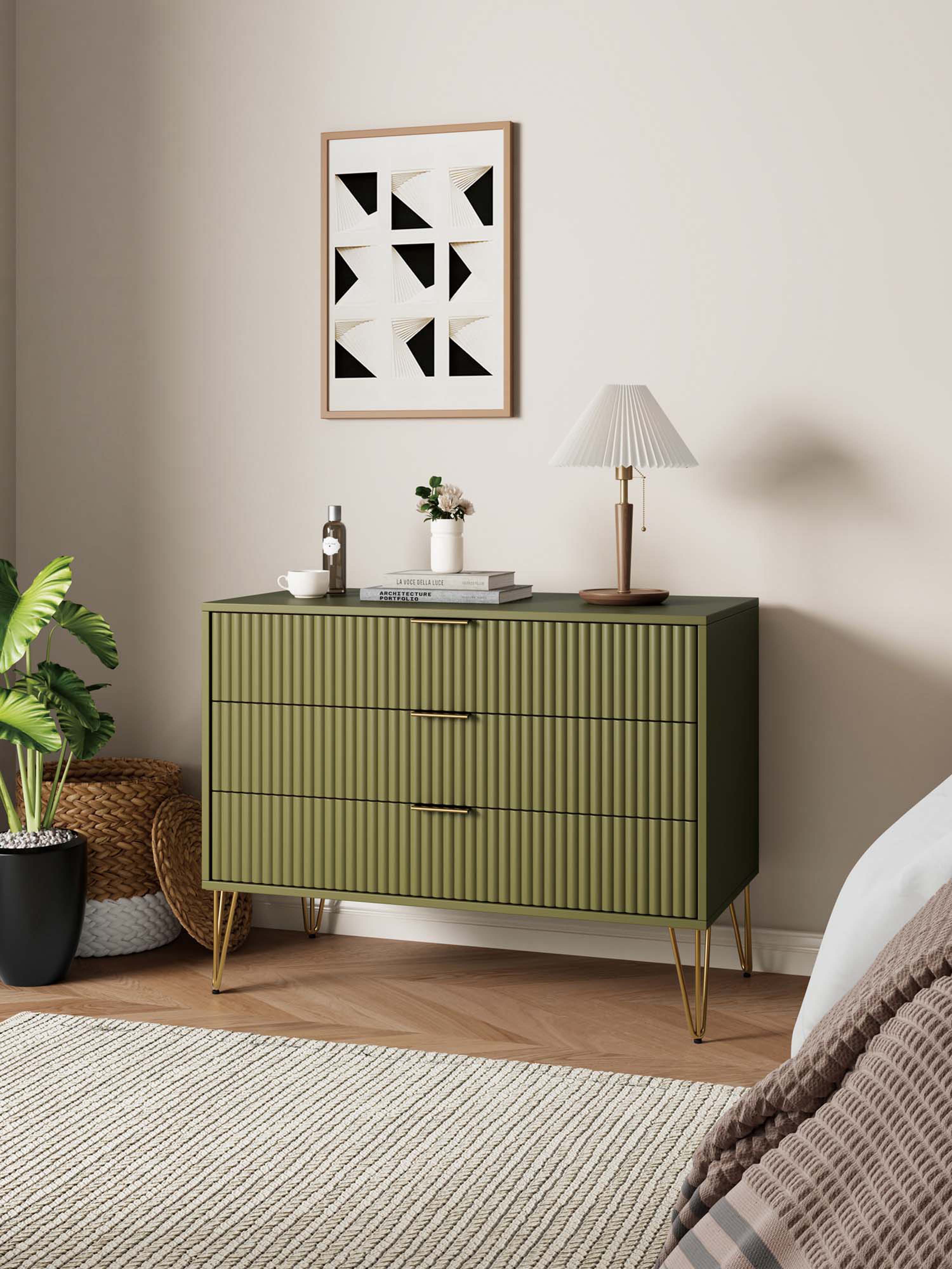 - Includes 3 Full Extension Drawer with Top Drawer Designed in Vertical Textured Ribbed Lines.