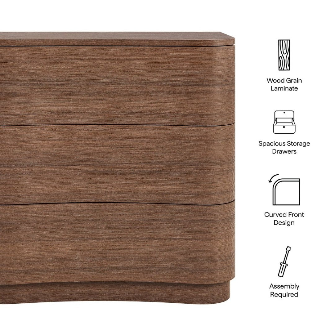 - 3-Drawer Compact Dresser Sculpted Curved Drawer Fronts Wood Grain Laminate Finish Engineered Wood Construction Assembly Required