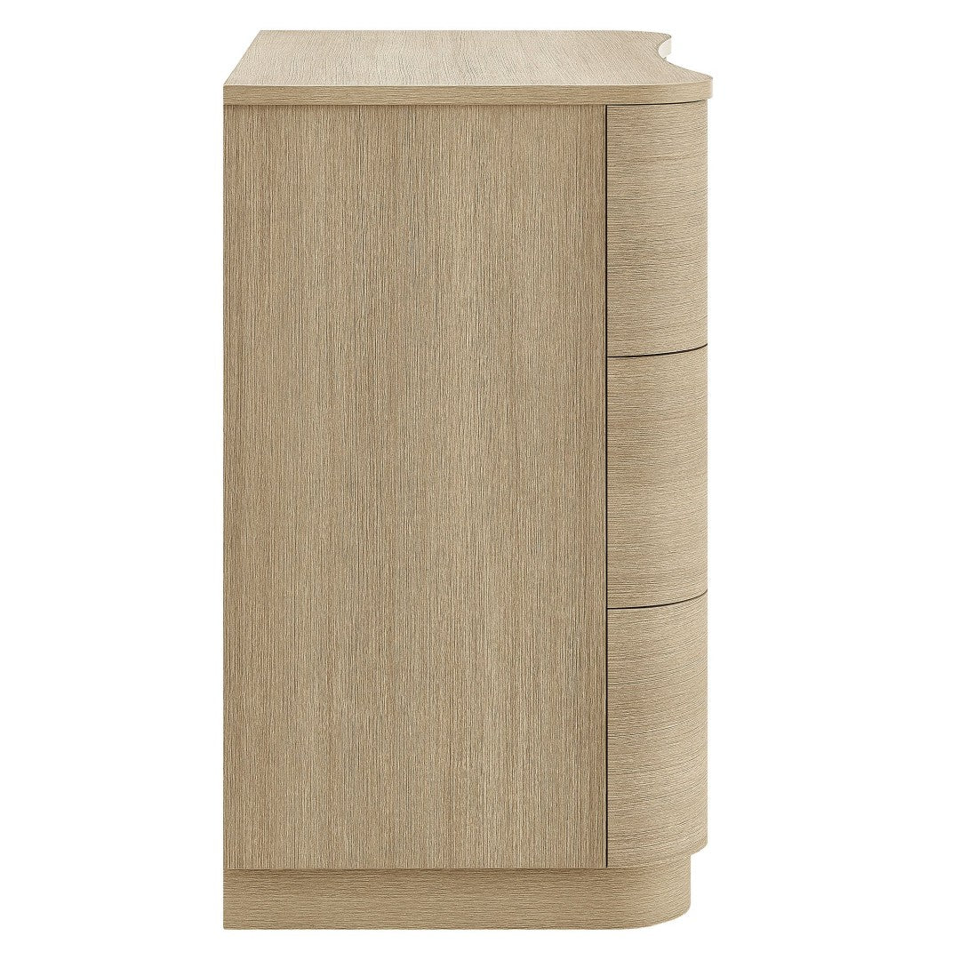 Elevate compact living with the Mirae 3-Drawer Curved Dresser — a sculptural, space-savvy storage solution that pairs graceful form with everyday function. Its gently curved fronts and smooth wood grain laminate create a calm, contemporary silhouette that works equally well as a narrow chest, a tall nightstand, or a small apartment dresser. Thoughtful proportions and generous drawer capacity make it ideal for organizing clothing, bedside essentials, or dorm-room necessities without sacrificing style.