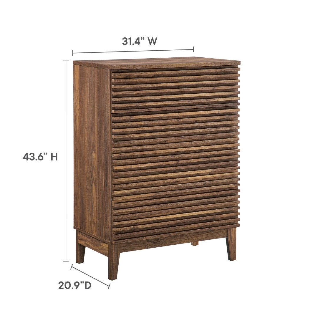 - Slatted-front design and wood-grain laminate finish deliver mid-century modern appeal that complements minimalist and contemporary interiors.