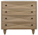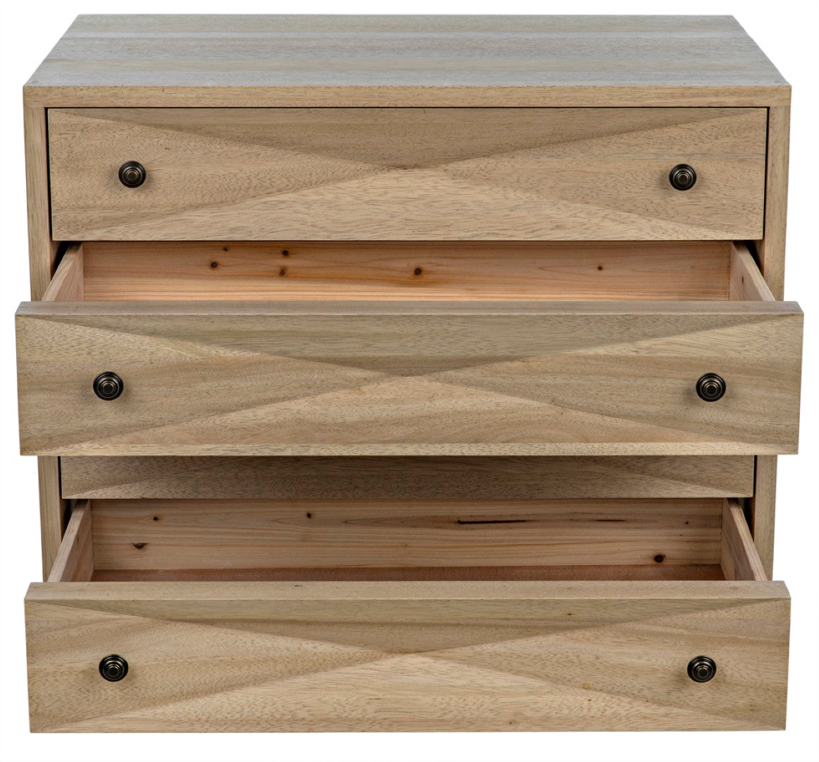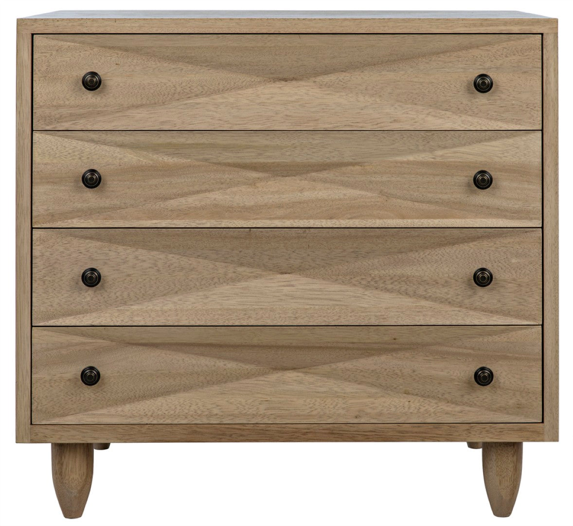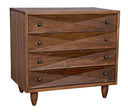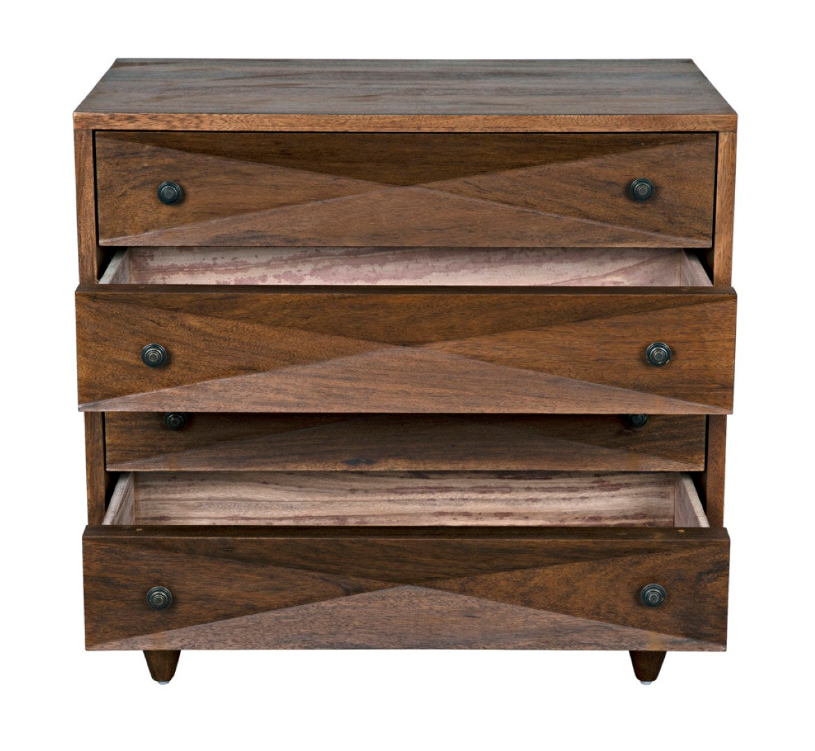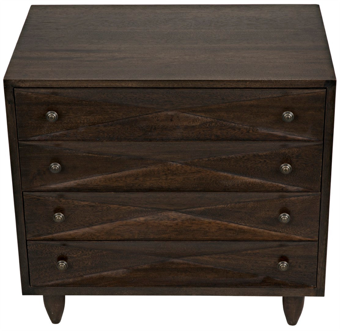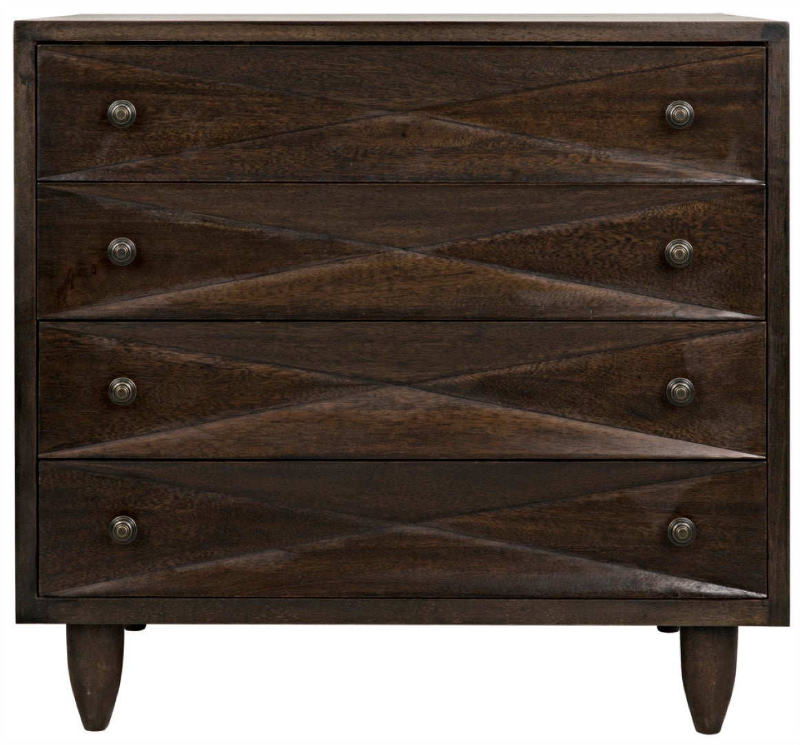 This striking walnut chest blends bold, geometric carving with clean, classic lines to create a versatile centerpiece for bedroom or entryway. Large diamond-shaped reliefs give it sculptural presence while the dark walnut finish and simple metal pulls maintain a refined, timeless look. Sturdy peg legs and quality walnut veneer construction ensure durability and enduring style.