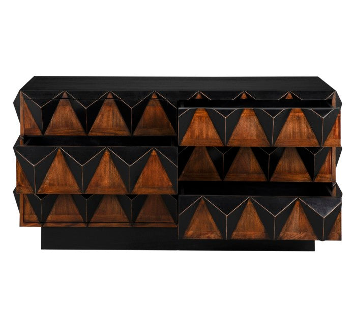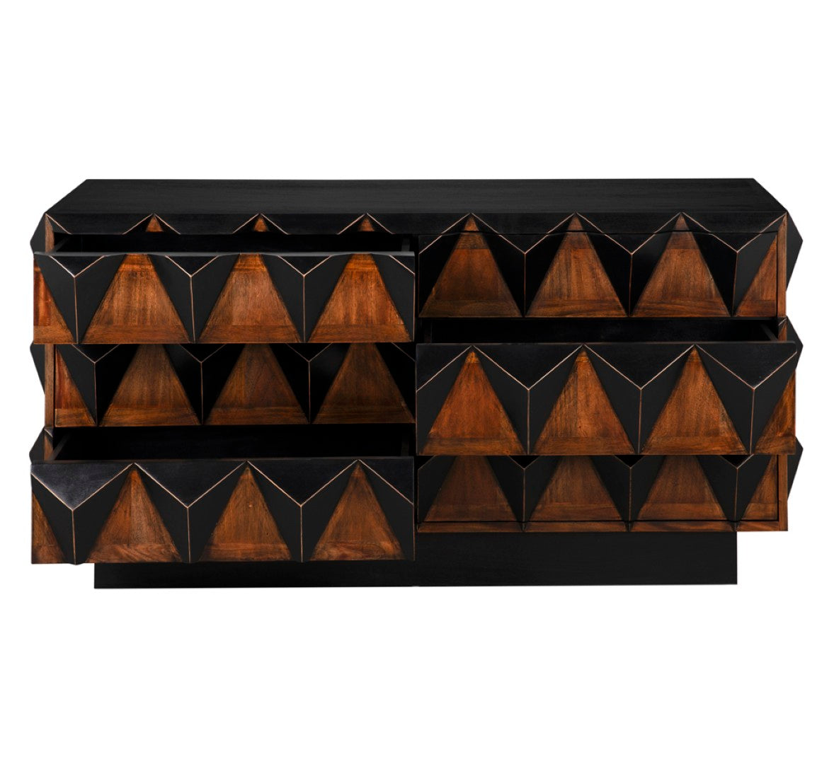 Elevate your bedroom or hallway with the Nigel Chest — a striking two-tone six-drawer chest that blends artisan craftsmanship with bold, modern detailing. Its hand-rubbed finish and high-relief stud accents create a tactile, sculptural presence while the rich mahogany veneer and subtle striae brushing add warmth and refined texture. Designed for both style and storage, this piece makes a confident focal point in contemporary or transitional interiors.